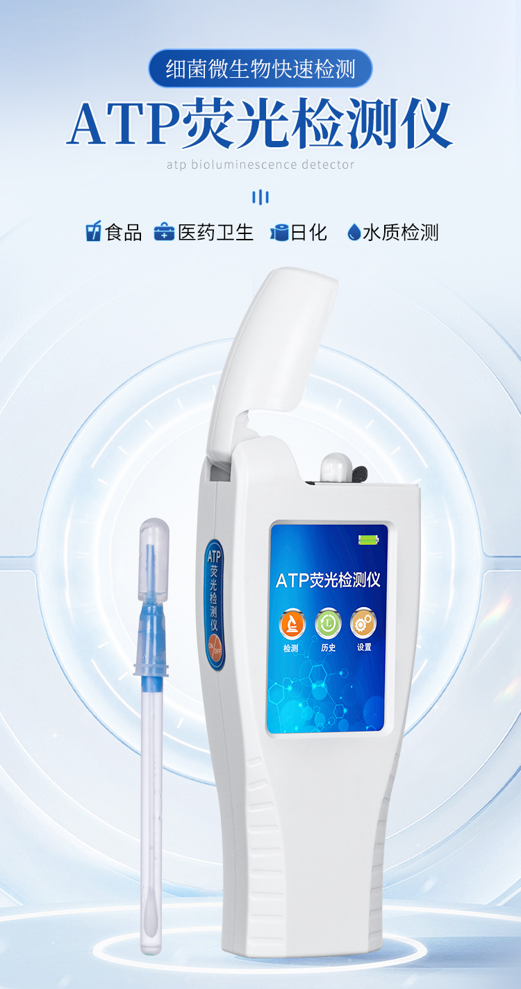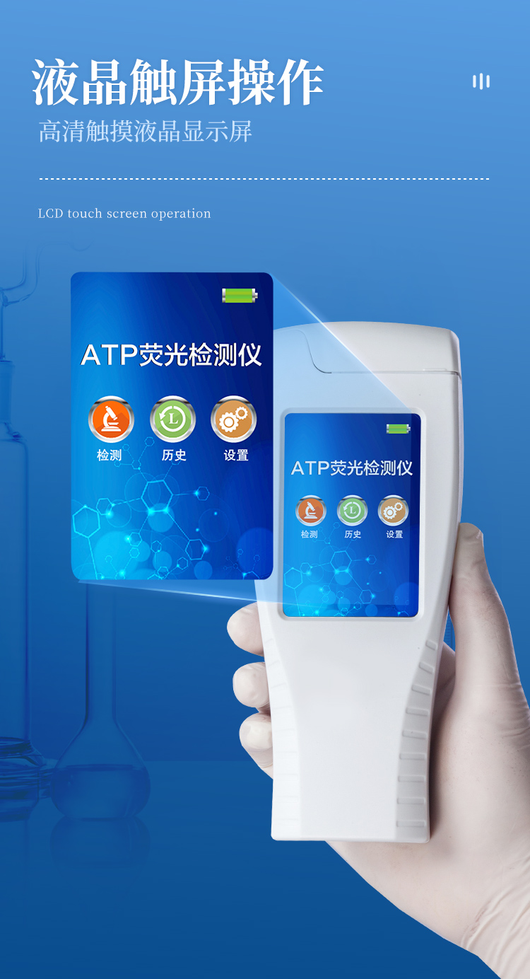 該設備為全新升級產(chǎn)品,大屏幕觸摸顯示屏,代替?zhèn)鹘y(tǒng)按鍵。操作采用生物化學反應方法檢測ATP含量,ATP熒光檢測儀基于螢火蟲發(fā)光原理,利用“熒光素酶—熒光素體系”快速檢測三磷酸腺苷(ATP)。ATP拭子含有可以裂解細胞膜的試劑,能將細胞內(nèi)ATP釋放出來,與試劑中含有的特異性酶發(fā)生反應,產(chǎn)生光,再用熒光照度計檢測發(fā)光值,微生物的數(shù)量與發(fā)光值成正比,由于所有生物活細胞中含有恒量的ATP,所以ATP含量可以清晰地表明樣品中微生物與其他生物殘余的多少,用于判斷衛(wèi)生狀況。