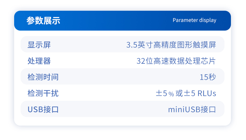 | 顯示屏:3.5英寸高精度圖形觸摸屏 | 處理器:32位高速數(shù)據(jù)處理芯片 | 檢測精度:********** | 大腸菌群:******** | 檢測范圍:*************** | 檢測時間:15秒 | 檢測干擾:±5﹪或±5 RLUs | 操作溫度范圍:5℃到40℃ | 操作濕度范圍:20—85﹪ | ATP回收率:90-110% | 檢出模式:RLU、大腸菌群篩查 | 50個用戶ID 設定 | 可設定的結果限值個數(shù):251個 | 自動判斷合格與不合格 | 自動統(tǒng)計合格率 | 內(nèi)置自校光源 | 開機30秒自檢 | 配有miniUSB接口,可將結果上傳至PC | 配備專用軟件驅(qū)動U盤代替?zhèn)鹘y(tǒng)光盤 | 儀器尺寸(W×H×D):188 mm×77mm×37mm | 使用可充電鋰電池免電池更換 | 備用狀態(tài)(20℃):6個月 | 中文操作手冊 | 穩(wěn)定的液體熒光素酶 | 潤濕的一體化采集拭子 |