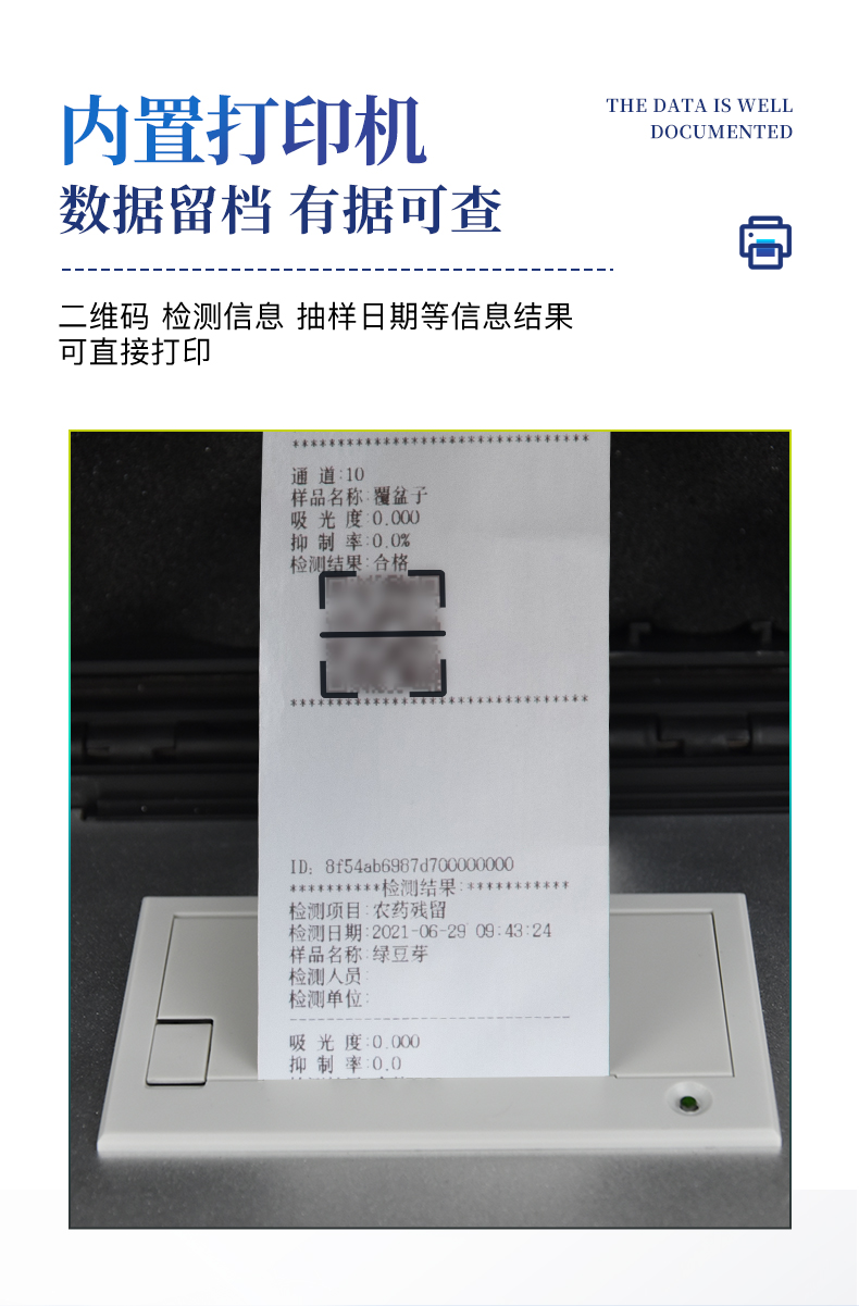 | 機(jī)箱采用工業(yè)級ABS工程塑料箱,方便攜帶,穩(wěn)固耐用,便于流動測試。 | 智能操作系統(tǒng),采用更加人性化操作,主控采用多核處理器,主頻1.88Ghz,運(yùn)轉(zhuǎn)速度更快速,穩(wěn)定性更強(qiáng)。 | 自動判斷樣品是否合格,檢測結(jié)果更加直觀。 | 儀器具有100多種蔬菜名稱菜單庫,分類管理,并可按需添加或刪除蔬菜名,編輯蔬菜名稱,可直接打印出蔬菜名稱。 | 檢測通道:6個檢測通道,可以同時測試多個樣品,循環(huán)檢測,即放即檢,每個樣品由程序控制分別獨(dú)立工作,不會互相干擾。 | 儀器具有wifi聯(lián)網(wǎng)功能,可將數(shù)據(jù)快速上傳電腦,進(jìn)行數(shù)據(jù)管理與統(tǒng)計,4G信號GPRS遠(yuǎn)傳功能,可插手機(jī)卡實(shí)現(xiàn)數(shù)據(jù)遠(yuǎn)傳平臺,。 | 顯示方式:7英寸高靈敏真彩觸摸屏顯示,人性化中文操作界面,讀數(shù)直觀、簡單。 | 打印機(jī)采用串口5v打印,可選擇手動打印或者自動打印,三分鐘出打印結(jié)果,打印格式為檢測人姓名、吸光度差值、檢測時間、檢測機(jī)構(gòu)、樣品名稱及結(jié)果判定。 | 光源采用進(jìn)口超高亮發(fā)光二極管,具有低功耗、高精度、穩(wěn)定性強(qiáng)、光源可控可以關(guān)掉不使用的光源,響應(yīng)速度快等優(yōu)點(diǎn)。 | 智能恒流穩(wěn)壓,光強(qiáng)自動校準(zhǔn),長時間連續(xù)工作光源無溫漂現(xiàn)象。 | 采用USB2.0接口設(shè)計,方便數(shù)據(jù)的存貯和移動,并可隨時與計算機(jī)直接相連,并且可用計算機(jī)控制儀器。實(shí)現(xiàn)數(shù)據(jù)查詢、瀏覽、分析、統(tǒng)計、打印等。 | 智能化程度高,儀器具有自檢功能:具有開機(jī)自檢和調(diào)零功能,具有自動檢測重復(fù)性功能 | 儀器具有自身保護(hù)功能,可設(shè)置用戶名及密碼,防止非工作人員操作等。 | 采用DC12v直流供電,安全系統(tǒng)更高,并且配備6A鋰電池充電器。 | 儀器具有重新校準(zhǔn)、鎖定、恢復(fù)出廠設(shè)置功能。 |