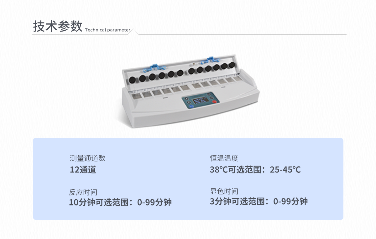 測量通道數:12通道恒溫溫度:38℃可選范圍:25-45℃反應時間:10分鐘可選范圍:0-99分鐘顯色時間:3分鐘可選范圍:0-99分鐘