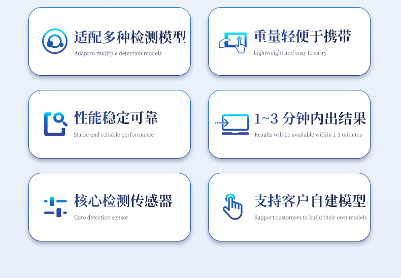 | ◆ 進(jìn)口核心檢測(cè)傳感器,性能穩(wěn)定可靠; | ◆ 快速無(wú)損檢測(cè),1~3 分鐘內(nèi)出結(jié)果; | ◆ 10 吋觸屏操作簡(jiǎn)單,使用方便; | ◆ 適用性廣,可適配多種檢測(cè)模型; | ◆ 支持客戶(hù)自建模型; | ◆ 體積小、重量輕,便于攜帶; |
