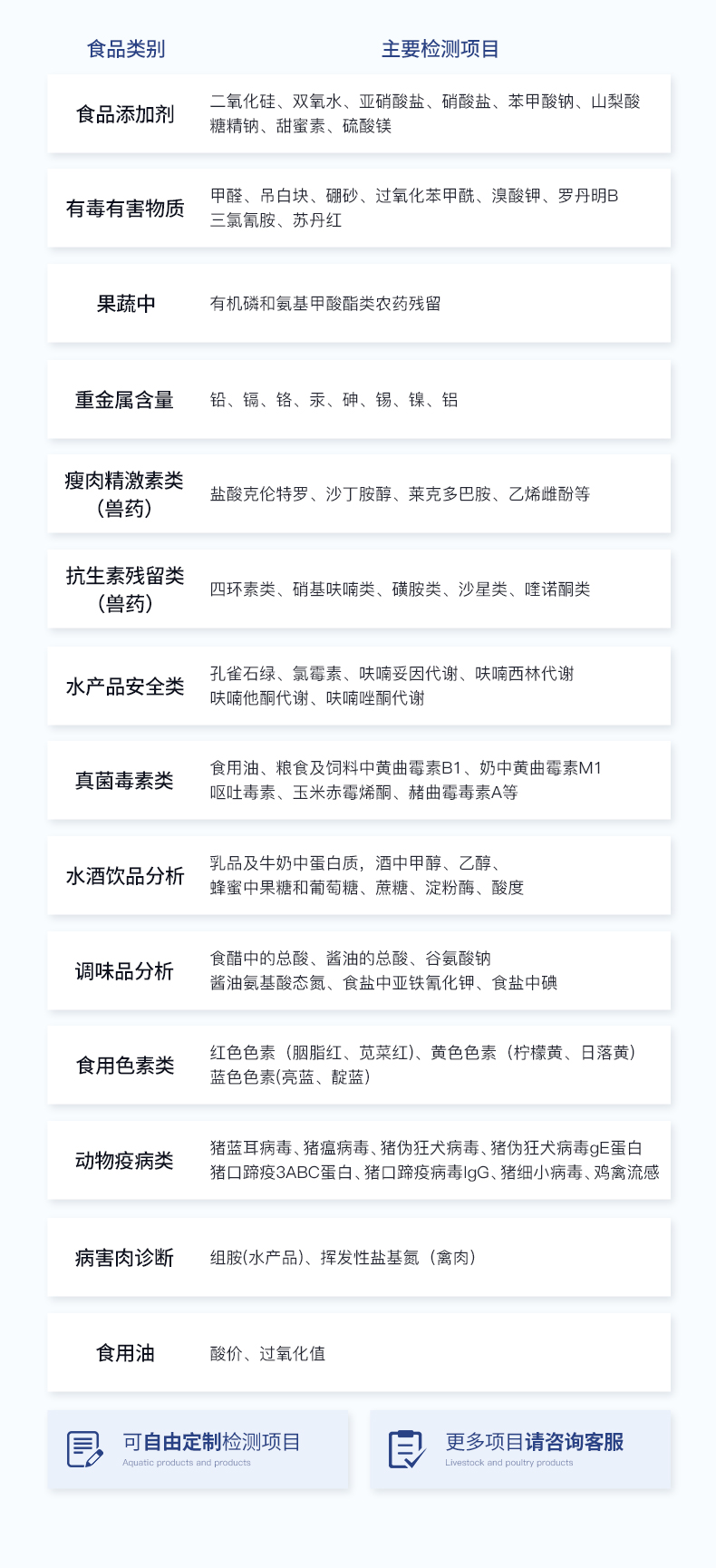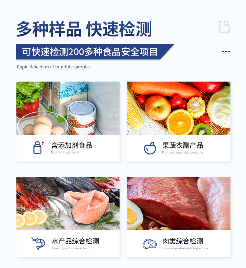 | 食品添加劑:二氧化硫、雙氧水、亞硝酸鹽、硝酸鹽、苯甲酸鈉、山梨酸、糖精鈉、甜蜜素、安賽蜜、硫酸鎂等 | 有毒有害物質:甲醛、吊白塊、硼砂、過氧化苯甲酰、溴酸鉀、羅丹明B、三聚氰胺、蘇丹紅等 | 果蔬中:有機磷和氨基甲酸酯類農藥殘留; | 病害肉診斷:組胺、揮發性鹽基氮、肉制品酸價、水發產品中組胺 | 重金屬含量:鉛、鎘、鉻、汞、砷、錫、鎳、鋁等;食用油脂檢測:過氧化值、酸價、油脂丙二醛等。 | 瘦肉精激素類(獸藥):鹽酸克倫特羅、沙丁胺醇、萊克多巴胺、己烯雌酚、喹乙醇等 | 抗生素殘留類(獸藥):四環素類、硝基呋喃類、磺胺類、沙星類、喹諾酮類、慶大霉素、鏈霉素、阿莫西林、紅霉素等 | 水產品安全類:孔雀石綠、氯霉素、呋喃妥因代謝、呋喃西林代謝、呋喃它酮代謝、呋喃唑酮代謝等 | 真菌毒素類:食用油、糧食及飼料中黃曲霉毒素B1、奶中黃曲霉毒素M1、嘔吐毒素、玉米赤霉烯酮、赭曲霉毒素A等 | 水酒飲品分析:乳品及牛奶中蛋白質;酒中甲醇、乙醇、雜醇油;蜂蜜中果糖和葡萄糖、蔗糖、淀粉酶、酸度;水中氰化物、余氯,飲料中維C等 | 調味品成分:食醋的總酸、醬油的總酸、芝麻油純度、谷氨酸鈉、醬油氨基酸態氮、食鹽中亞鐵氰化鉀、食鹽中碘等 | 食用色素類:紅色色素(胭脂紅、莧菜紅、赤蘚紅、誘惑紅)、黃色色素(檸檬黃、日落黃)、藍色色素(亮藍)等 | 動物疫病類:豬藍耳病毒、豬瘟病毒、豬偽狂犬病毒、豬偽狂犬病毒gE蛋白、豬口蹄疫3ABC蛋白、豬口蹄疫病毒IgG、豬細小病毒、雞禽流感等 |