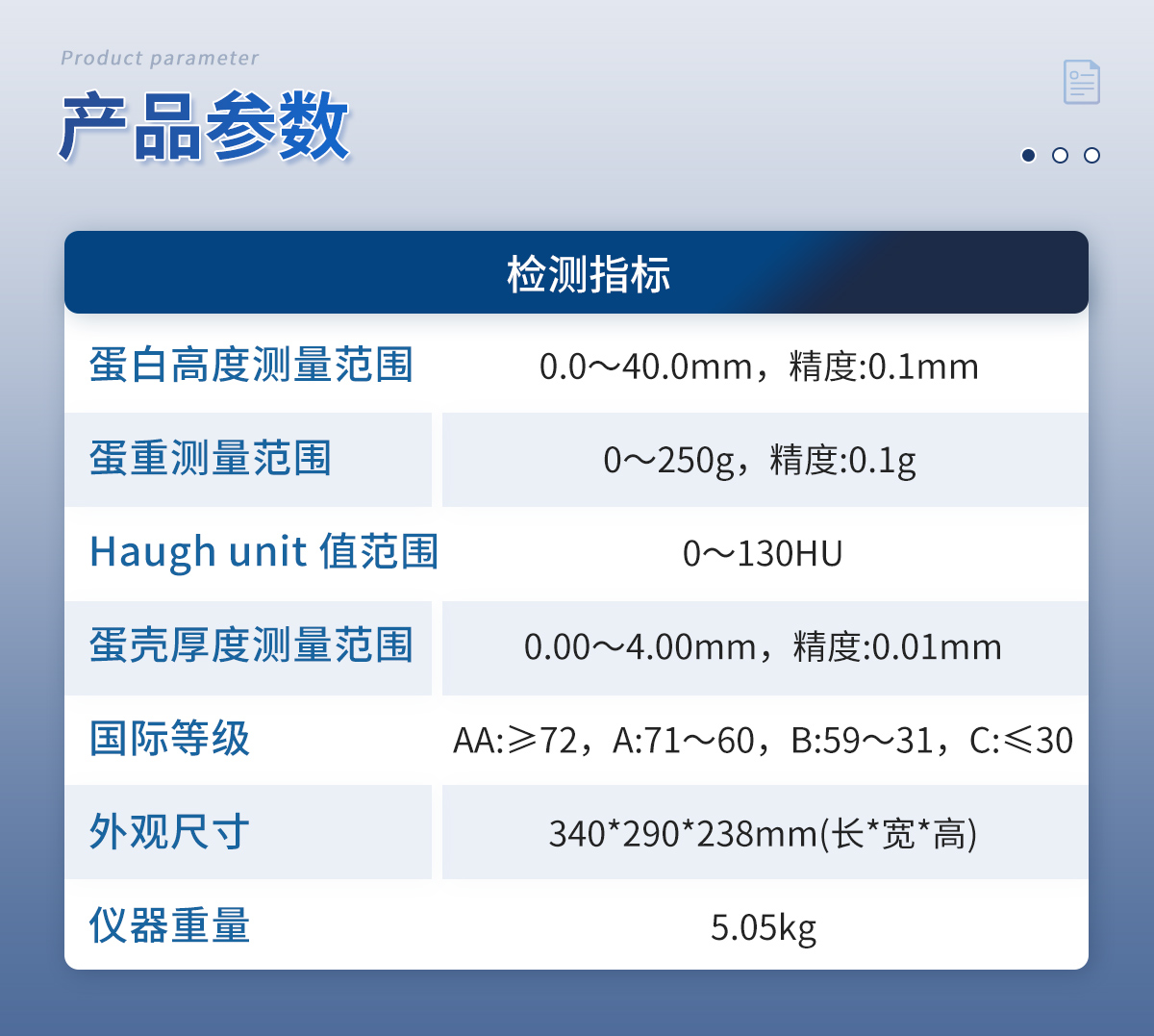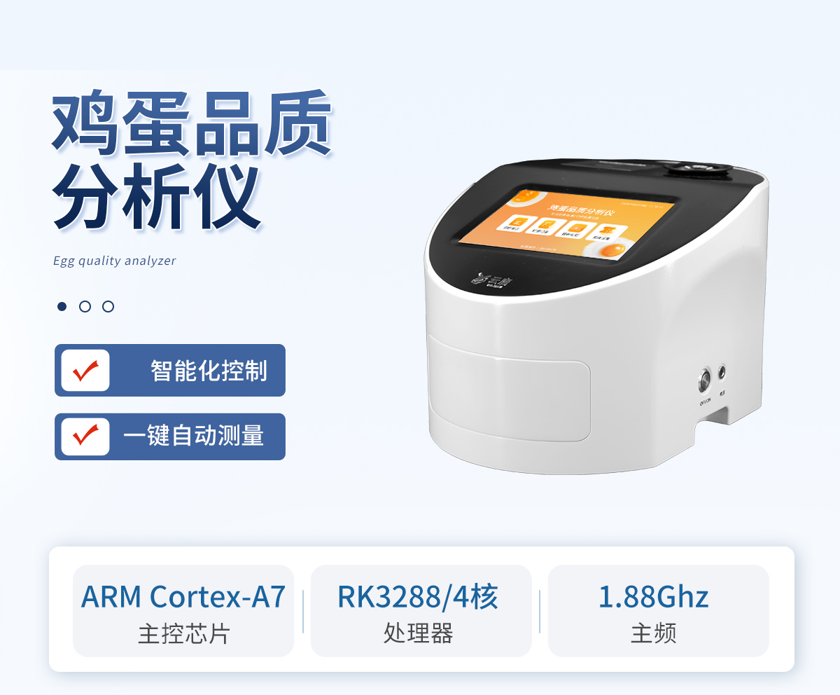 | 1.儀器采用7英寸液晶觸摸屏,搭配運行安卓智能操作系統,主控芯片采用ARM Cortex-A7,RK3288/4核處理器,主頻1.88Ghz,操作方便,性能更強。 | 2.儀器采用智能化控制,可一鍵自動測量蛋重、蛋白高度、新鮮度(哈夫單位)、蛋黃高度、蛋殼厚度。 | 3.高精度數字傳感器,測量結果精度高,穩定性好。 | 4.創新采用高精超聲波傳感器測試蛋白高度,精密傳感器測試蛋黃顏色,無需直接接觸蛋液,減少誤差存在。 | 5.儀器測試性能穩定,不受操作人員的能力影響,方便簡單。 | 6.可一鍵自動測量哈夫單位、蛋重、蛋白高度、蛋黃高度和蛋殼厚度,把測試時間縮短到 17 秒。 | 7.儀器可本機存儲數據,可連接USB端口將數據導出存儲。另外,儀器自帶數據上傳模塊,具有WIFI聯網上傳、RJ45網線連接功能,數據可實現局域網和互聯網數據上傳,檢測結果可選擇直接傳至數據平臺,進行大數據分析處理與數據統計,達到長期分析監測的目的。 | 8.打印系統:內置全新打印機,可以打印項目名稱、二維碼、抽樣信息、檢測信息、受檢信息、復核信息、抽樣日期、檢測日期等信息。 | 9.供電模式:儀器交直流兩用,直流12V供電(標配),可連接車載電源,亦可選配6ah大容量充電鋰電池,方便戶外流動測試。 | 10.儀器具有重新校準、鎖定功能。 | 11.檢測指標: | (1)蛋白高度測量范圍:0.0~40.0mm,精度:0.1mm ; | (2)蛋重測量范圍:0~250g,精度:0.1g ; | (3) Haugh unit 值范圍:0~130HU; | (4)國際等級:AA:≥72,A:71~60,B:59~31,C:≤30; | (5)蛋殼厚度測量范圍:0.00~4.00mm,精度:0.01mm 。 | 12.外觀尺寸:340*290*238mm(長*寬*高),儀器重量:5.05kg。 |