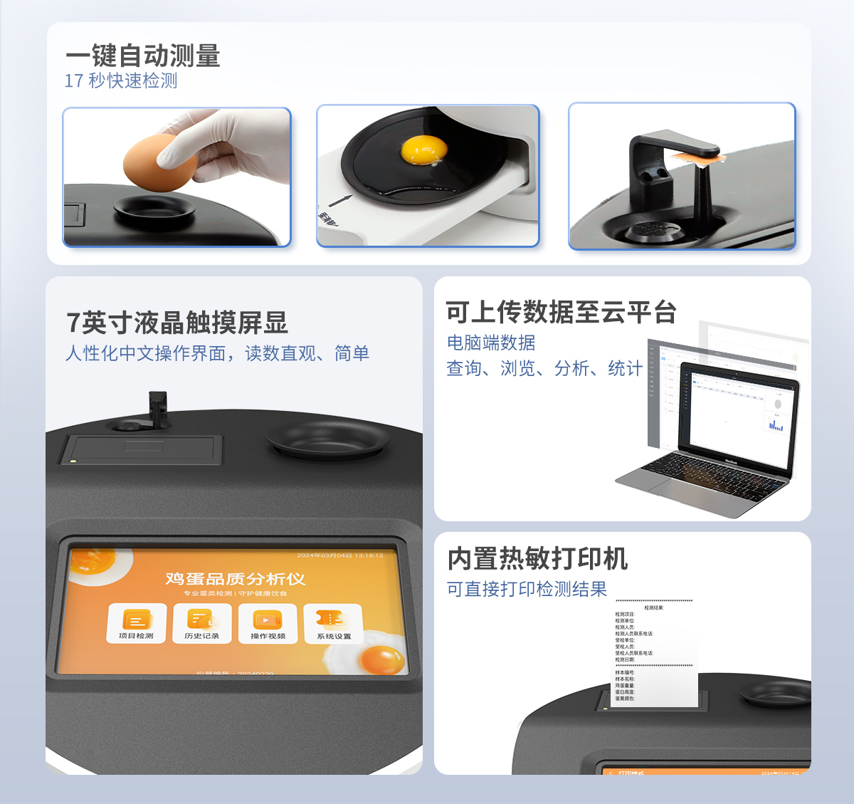 隨著消費者對食品安全問題的日益關注,雞蛋品質檢測成為了保障雞蛋質量、維護消費者健康權益的重要手段。我司生產的雞蛋品質檢測儀可通過專業的檢測項目和方法,進行雞蛋的品質檢測和分析。