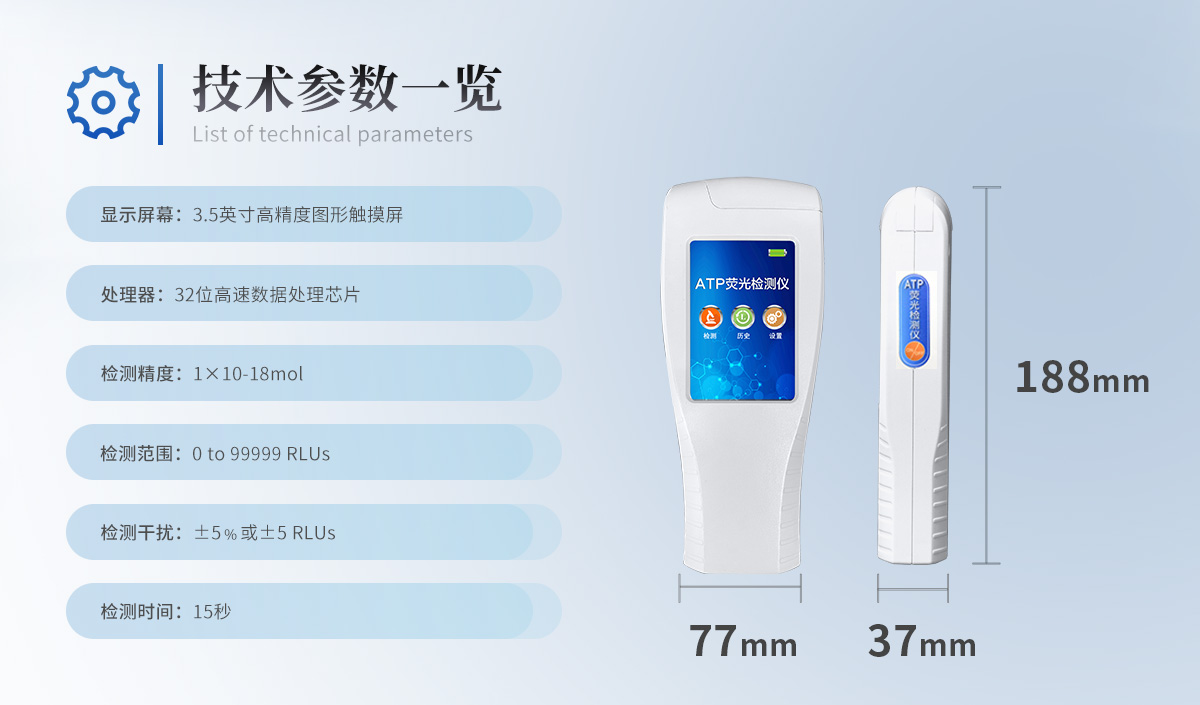 該設(shè)備為全新升級產(chǎn)品,大屏幕觸摸顯示屏,代替?zhèn)鹘y(tǒng)按鍵。操作采用生物化學(xué)反應(yīng)方法檢測ATP含量,ATP熒光檢測儀基于螢火蟲發(fā)光原理,利用“熒光素酶—熒光素體系”快速檢測三磷酸腺苷(ATP)。ATP拭子含有可以裂解細(xì)胞膜的試劑,能將細(xì)胞內(nèi)ATP釋放出來,與試劑中含有的特異性酶發(fā)生反應(yīng),產(chǎn)生光,再用熒光照度計(jì)檢測發(fā)光值,微生物的數(shù)量與發(fā)光值成正比,由于所有生物活細(xì)胞中含有恒量的ATP,所以ATP含量可以清晰地表明樣品中微生物與其他生物殘余的多少,用于判斷衛(wèi)生狀況。