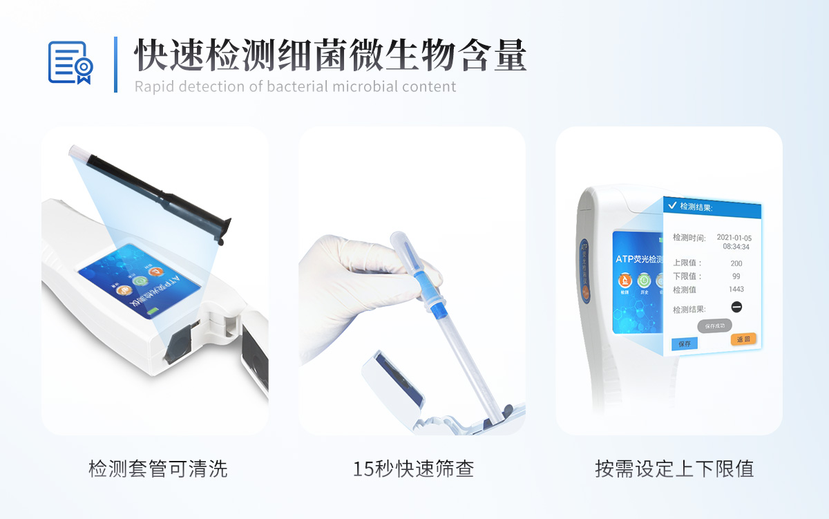 | 實(shí)用性 —— 可根據(jù)環(huán)境檢測需求設(shè)定上下限值,做到數(shù)據(jù)快速評估預(yù)警,表面潔凈度快速篩查。 | 靈敏度高 —— *************** | 速度快 —— 常規(guī)培養(yǎng)法18-24h以上,而ATP只需要十幾秒鐘 . | 可行性 —— 微生物數(shù)量與微生物體內(nèi)所含ATP有明確的相關(guān)性。 通過檢測ATP含量,可間接得出反應(yīng)中微生物數(shù)量 | 可操作性 —— 傳統(tǒng)培養(yǎng)方法需要在實(shí)驗(yàn)室由經(jīng)過培訓(xùn)的技術(shù)人員進(jìn)行操作;而ATP快速潔凈度檢測操作非常簡便,只需簡單的培訓(xùn)即可由一般工作人員進(jìn)行現(xiàn)場操作。 | 體驗(yàn)更好 —— 試子套管采用插拔式靈活設(shè)計(jì),可定期清洗長期使用,延長儀器壽命。 |