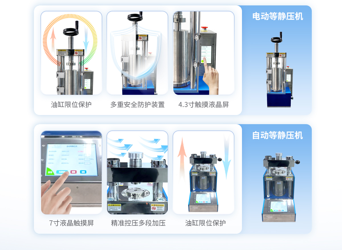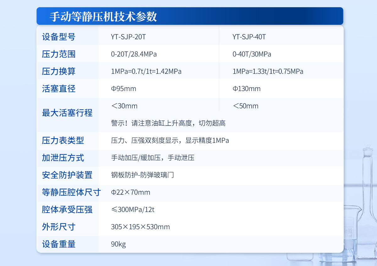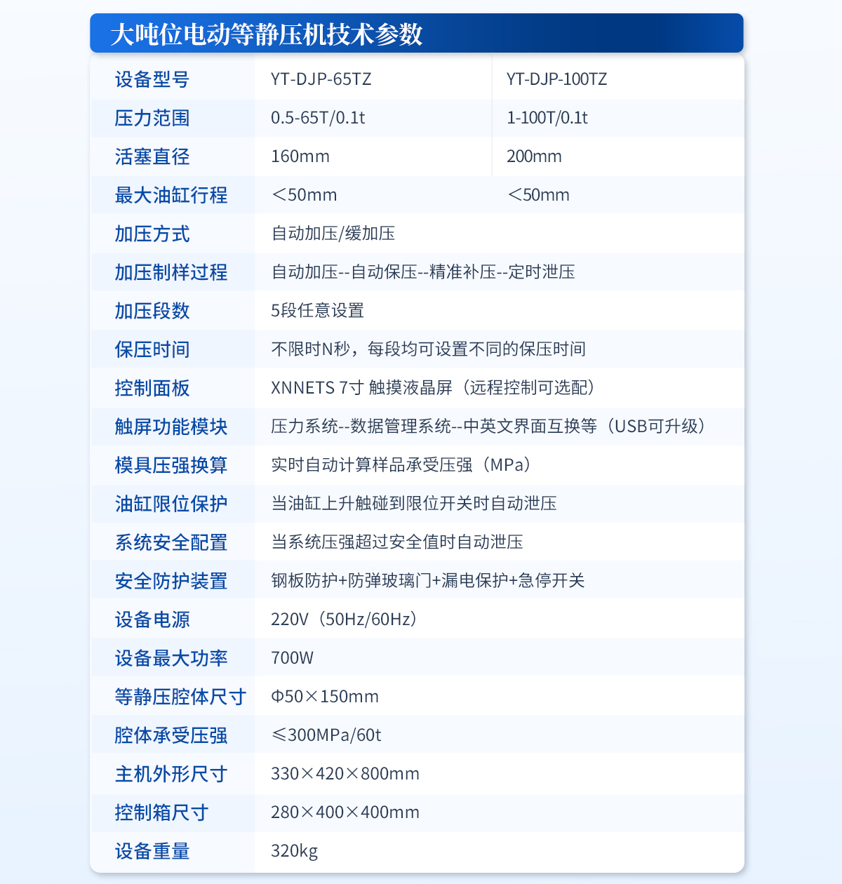 | 規格型號:YT-ZJP-30T | 壓力范圍:0.3-30T/0.1t | 活塞直徑 :Φ110mm | **油缸行程:<30mm | 加壓方式:自動加壓/緩加壓 | 加壓制樣過程:自動加壓--自動保壓--精準補壓--定時泄壓 | 加壓段數:5段任意設置 | 保壓時間 :不限時N秒,每段均可設置不同的保壓時間 | 控制面板:XNNETS 7寸 觸摸液晶屏(遠程控制可選配) | 觸屏功能模塊:壓力系-統-數據管理系統--中英文界面互換等(USB可升級) | 模具壓強換算:實時自動計算樣品承受壓強(MPa) | 油缸限位保護:當油缸上升觸碰到限位開關時自動泄壓 | 系統安全配置:當系統壓強超過安全值時自動泄壓 | 安全防護裝置:鋼板防護+防彈玻璃門+漏電保護+急停開關 | 設備電源:220V(50Hz/60Hz) | 設備**功率:400W | 等靜壓腔體尺寸:Φ30×150mm | 腔體承受壓強:≤300MPa/22t | 外形尺寸:240×390×560mm | 設備重量:120kg | 配置說明:等靜壓機1臺!可根據需求定制500MPa等靜壓機或橡膠模具 |