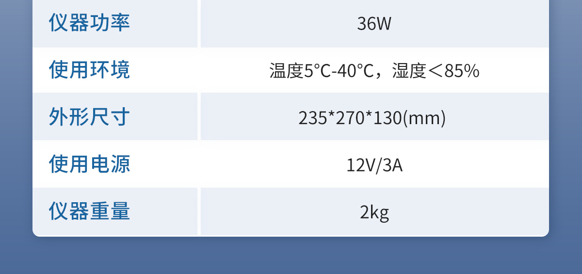 | 1.測量范圍:0.01%至100% | 2.靈 敏 閾:0.01ug | 3.準 確 度:對于5μg-1mg為±2μg,對于1mg以上,為0.2%(不含進樣誤差) | 4.重 復 性:≤2% | 5.電解速度:2min | 6.攪拌速度:1-10檔(可調) | 7.零點平衡時間:1min | 8.儀器功率:36W | 9.使用環境:溫度5℃-40℃,濕度<85% | 10.外形尺寸:235*270*130(mm) | 11.使用電源:12V/3A | 12.儀器重量:2kg |