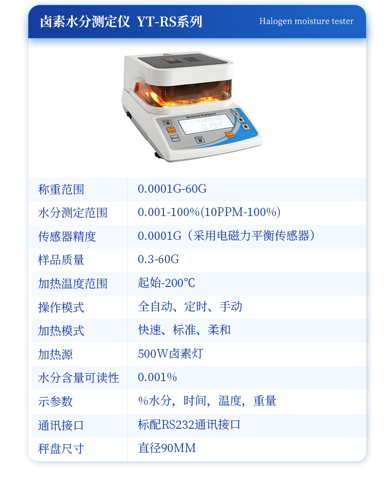 產(chǎn)品介紹: 高精度鹵素水分儀采用環(huán)形管鹵素加熱方式,快速干燥樣品,在干燥過程中,水分儀持續(xù)測量并即時(shí)顯示樣品丟失的水分含量%.2025-10-26