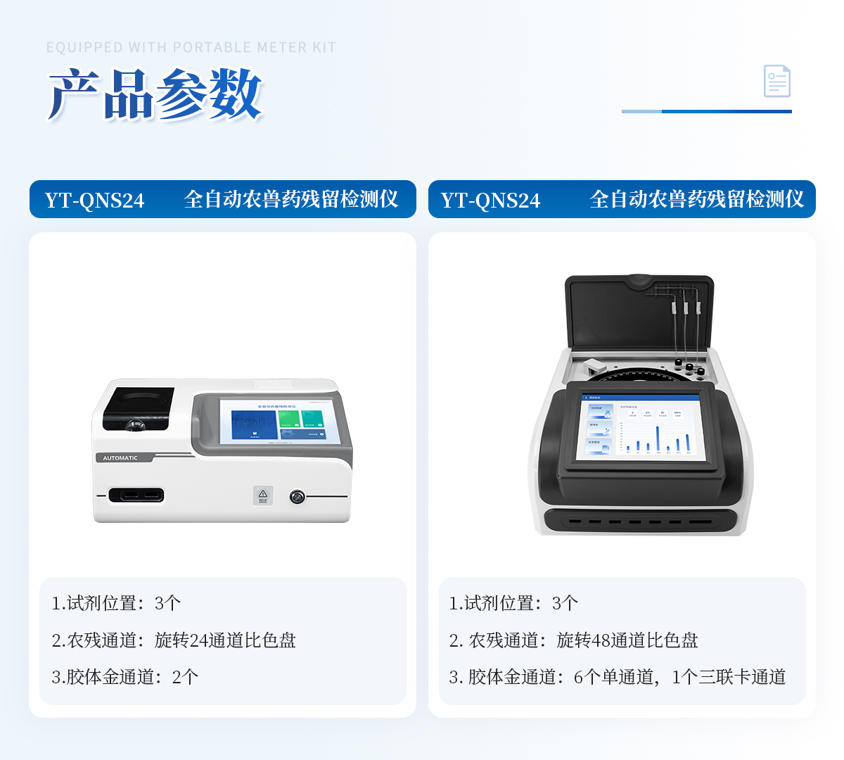 | 1. 試劑位置:3個 | 2. 農殘檢測盤:旋轉48通道比色盤,可任意選擇檢測通道,自動對應選擇通道。 | 3. 膠體金通道:6個單通道,1個三聯卡通道,可讀取檢測卡結果,自動采集、處理分析,自動判斷檢測結果,并具備自動判空功能。 | 4.系統配置:10.1寸高清液晶觸摸屏,采用ARM Cortex-A7,RK3288/4核處理器,運行內存1GB。Android7.1.1 系統分辨率1280×800。 | 5.恒溫系統:具有自動加溫溫控系統,精準恒溫37℃,精度±0.1℃。 | 6.添加系統:儀器按照試劑要求自動、按時、按量加入試劑,并且自動對未正常放置的樣本或異常的樣本進行檢查并提示。 | 7.清洗功能:儀器具備回流及自動清洗管路功能,避免試劑污染。 | 8.混勻功能:設備具備自動混勻功能。 | 9.光源校準:設備可自動校準,確保檢測準確度。 | 10.實時監控:儀器測試過程中屏幕顯示運行狀態,可實時查看。 | 11.數據存儲:內部存儲16GB,可存儲500萬條數據。 | 12.樣品多選功能:設備具備樣品一鍵多選功能,選擇樣品自動匹配檢測通道。 | 13.項目預設:可提前設置單個及多個相同或不相同的檢測任務,可單次或者多次調取,減少檢測時間。 | 14.自定義打印系統:內置自定義打印系統,可按需靈活設置開啟或關閉:產品合格證(國家農業部標準),二維碼,抽樣信息、檢測信息,受檢信息等信息的打印。 | 15.A4版本報告打印功能:設備可自動生成A4版報告,A4報告帶二維碼,可掃描二維碼生成電子版,并可識別真偽。 | 16.傳輸方式:儀器配備無線通信模塊: 4G(APN)通訊模塊、Wifi模塊,藍牙傳輸模塊,同時具有USB接口以及RJ45接口能以多種方式實現數據保存和數據傳輸功能,設備數據可以同步上傳至平臺。 | 17.數據監管系統:設備自帶監管平臺,并可同步對接監管平臺,數據可局域網和互聯網數據上傳,檢測結果可直接傳至食品安全監管平臺。達到食品安全問題預估、預警。 | 18.系統遠程更新功能:無需設備返廠,即可遠程實時升級全新系統,節省時間成本及避免運輸造成設備損。 |