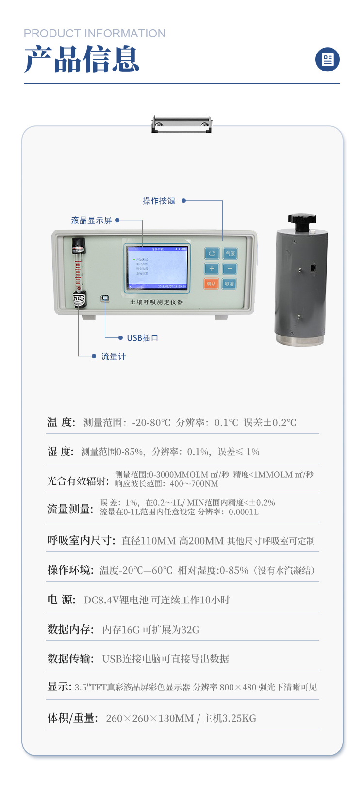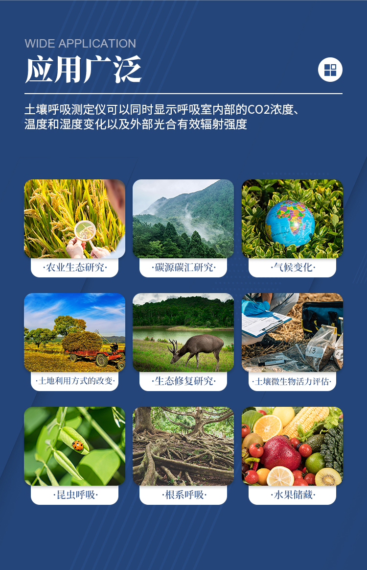 用于同步監測單點或多點從土壤表層向大氣排放CO2氣體的呼吸速率。廣泛應用在農業、林業、生態、氣象、地質等領域土壤碳排放規律方面的科學研究。