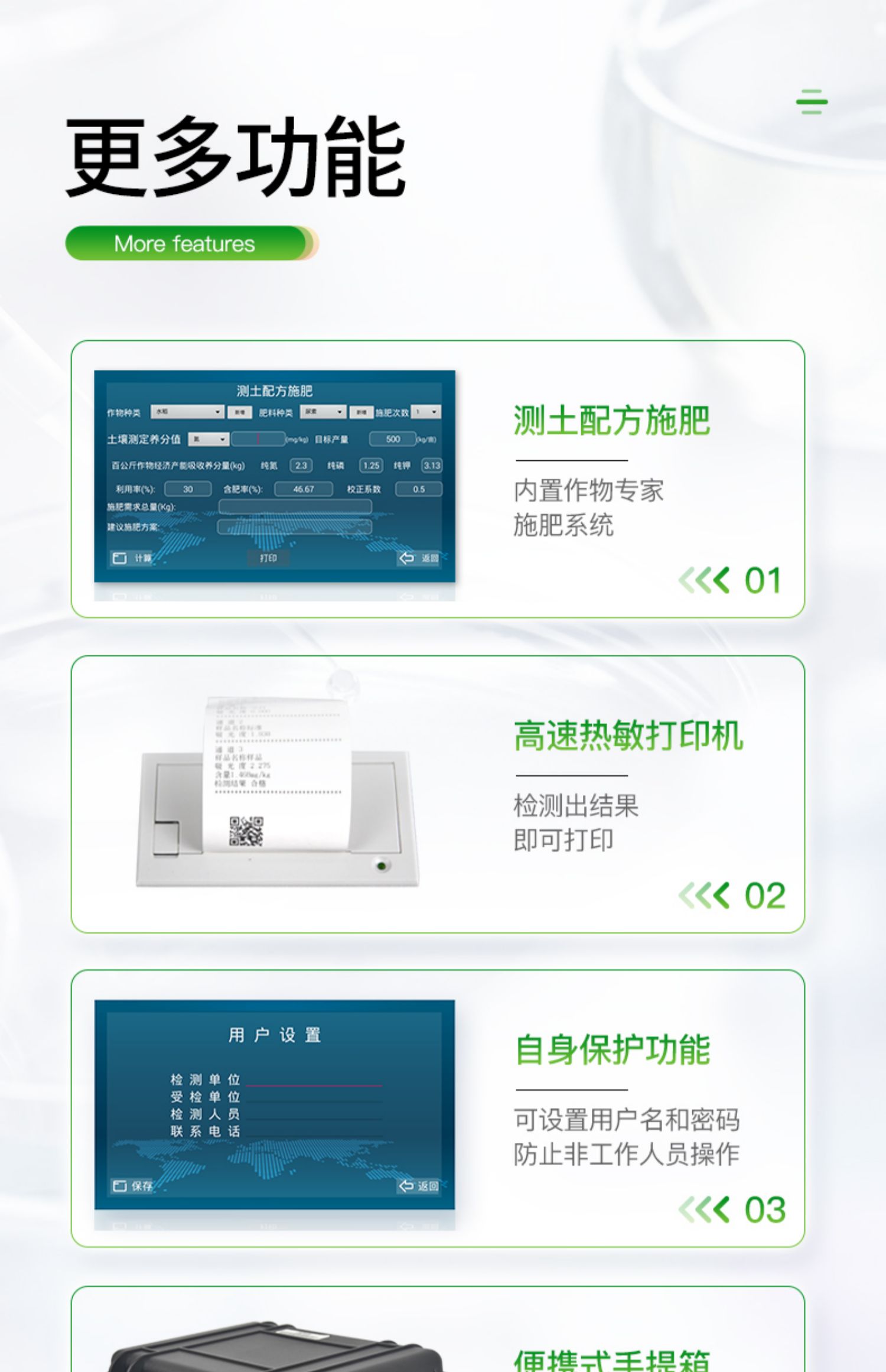 ★2、可檢測各種土壤、肥料、作物、食品、水質、環境等共200多個測試項目,一機多用,功能齊全。