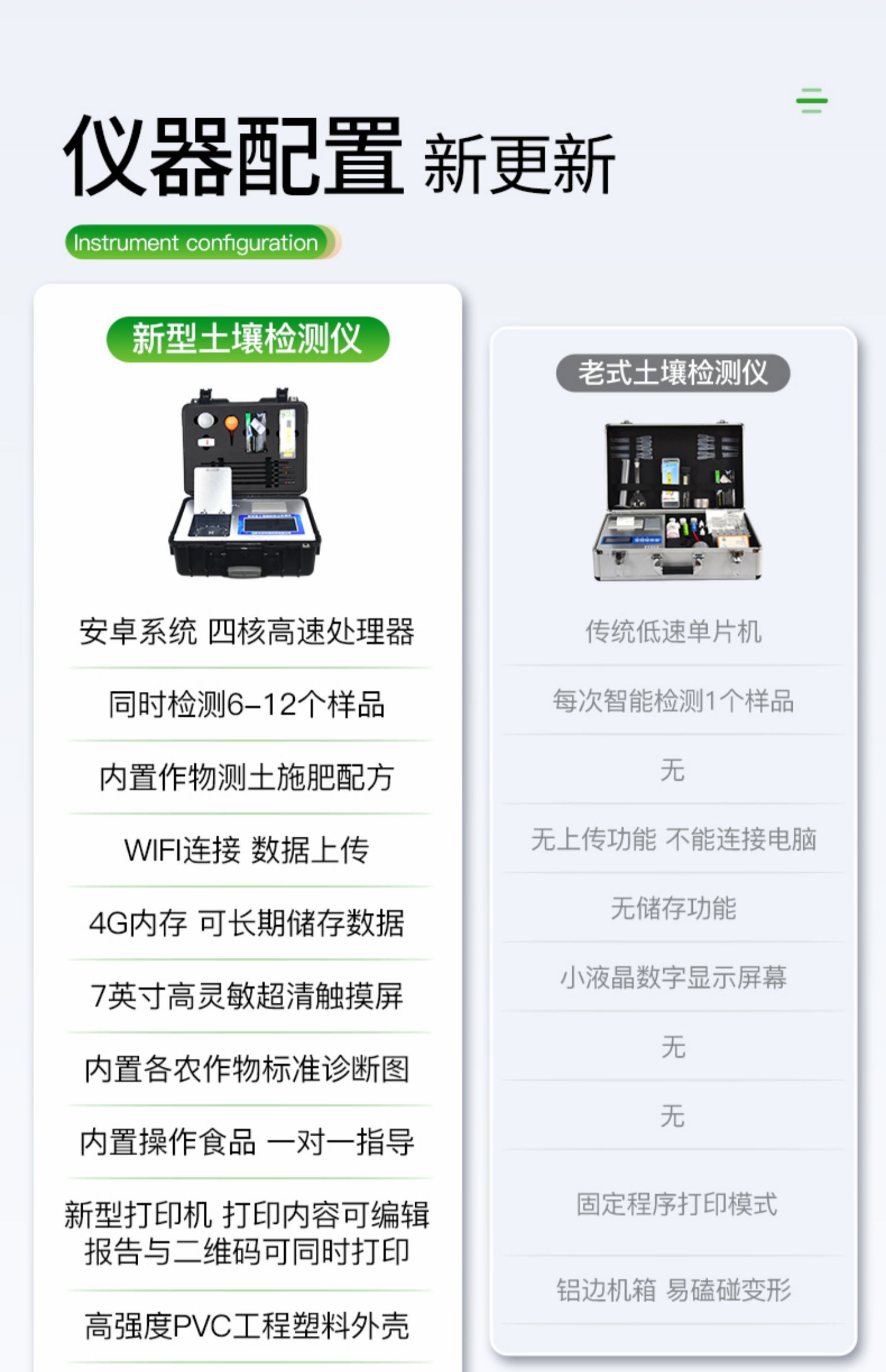 配套齊全:該儀器集藥、器、儀為一體,攜帶方便,相當于一個小型移動實驗室,無需用戶自配附件,亦可靈活野外流動測試。適于農業服務部門或農資經銷商、高教院校、科研院所、合作社、肥料廠商、大種植戶測土施肥和鑒別肥料真假及環保檢測應用。