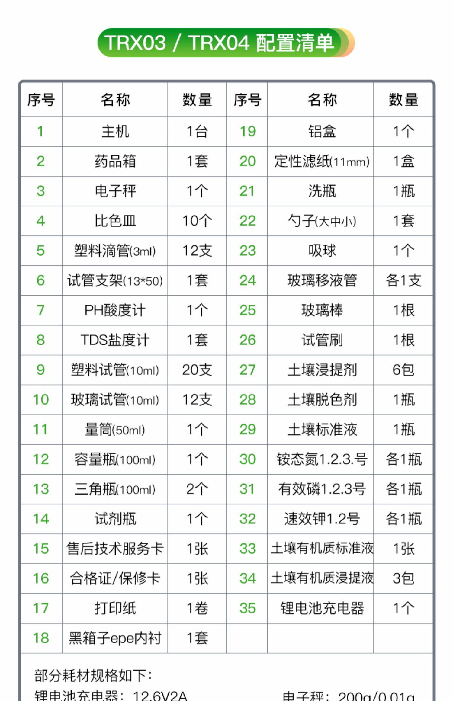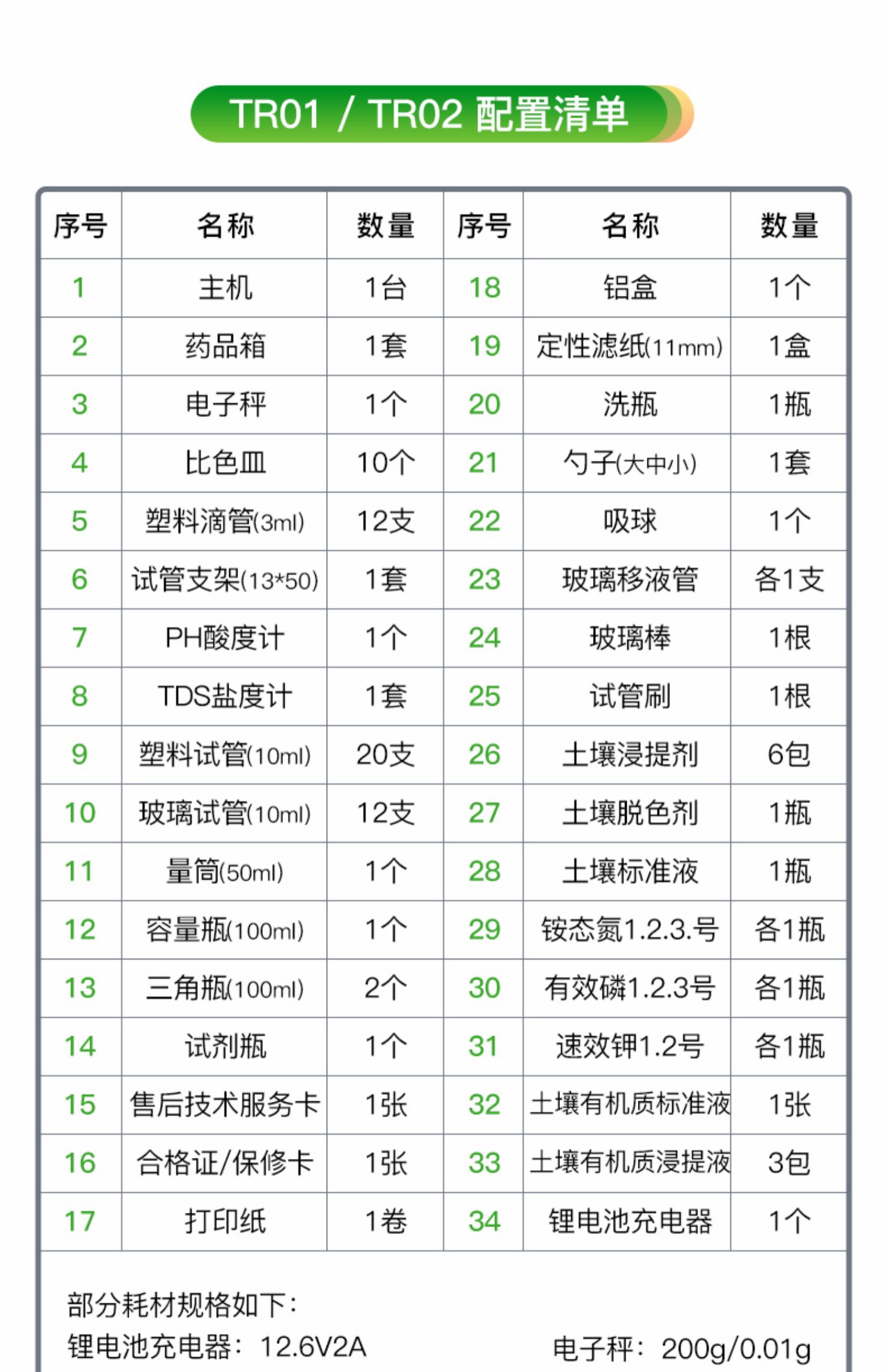 | 2 | PH計 | 1支 | 2 | 氮磷鉀有機質試劑 | 1套 |