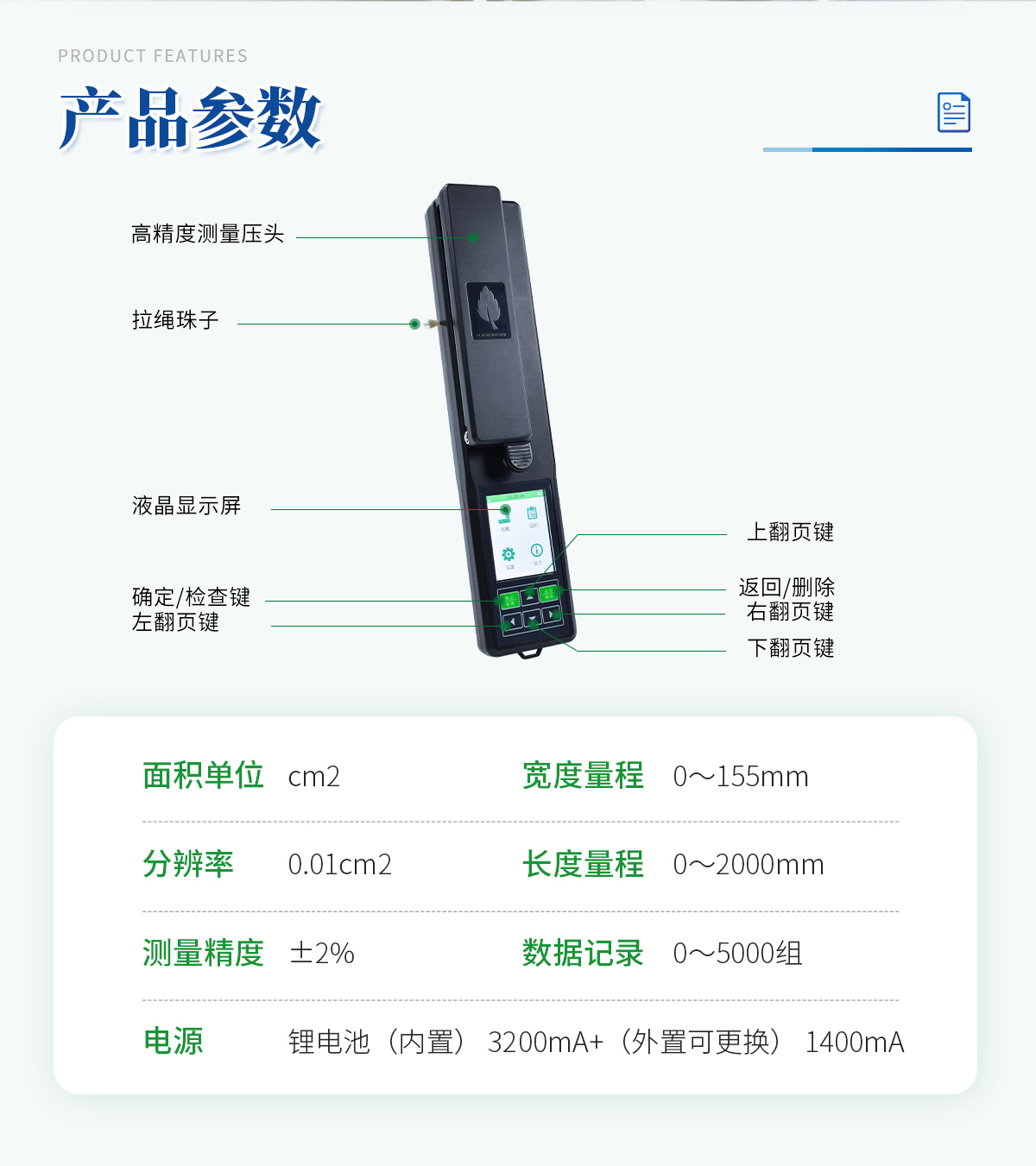 5)可存儲5000組數(shù)據(jù)(葉面積、葉長、葉寬)。