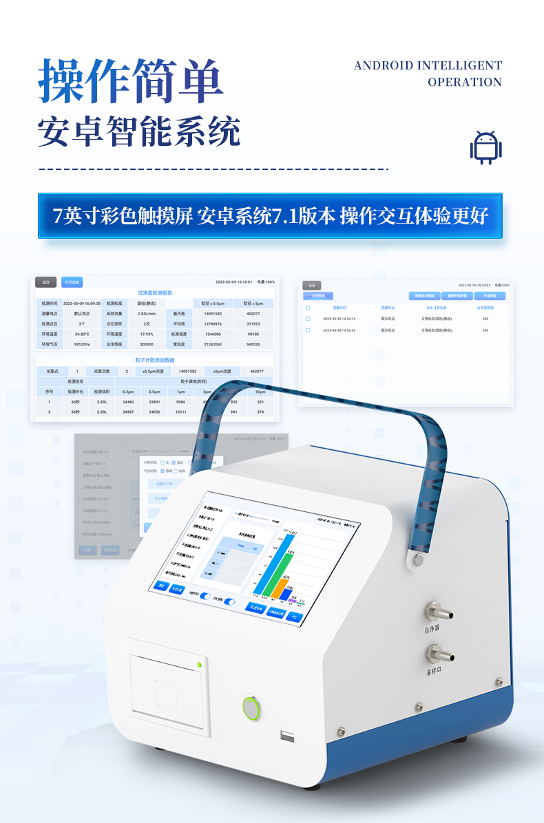 | 1、安卓系統7.1版本,操作交互體驗更好。 | 2、內置溫濕度傳感器、環境氣壓傳感器 | 3、核心部件光散射傳感器明顯消除腔體的雜散光,信噪比大為提高。從而使測量更準確更可靠。 | 4、按95%置信度(UCL)計算,計數結果可換算成m3和ft3 | 5、依照凈化級別劃分和規定,自動判定凈化級別,使用便利。 | 6、帶審計追蹤功能,可查詢、可追溯、可控制,符合FDA 21CFR PART11規范 | 7、支持wifi、藍牙傳輸,數據可無線上傳;同時支持U盤拷貝數據,免驅動插拔。 | 8、配置監管平臺,檢測結果可直接無線傳至平臺,進行潔凈度長短期分析,輔助管理。 | 9、內置新一代高速熱敏打印機,可選擇所需要打印的粒徑通道,靈活打印結果。 | 10、交直流兩用,內置充電鋰電池,環保耐用可支持連續采樣6小時以上。 | 11、便捷簡易伸縮式云臺支架,安裝采樣操作更加方便。 |
