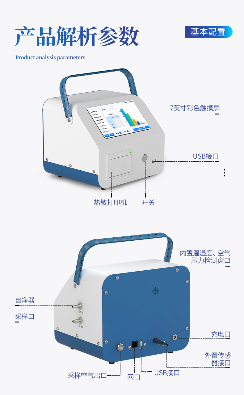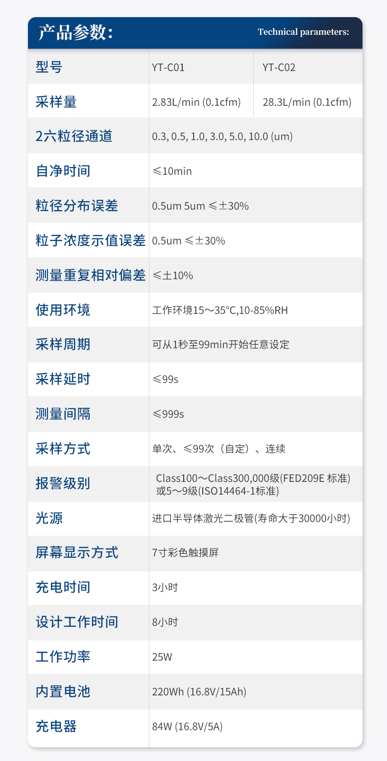| 采樣量:2.83L/min (0.1cfm) | 六粒徑通道:0.3,0.5,1.0,3.0,5.0,10.0(μm) | 自凈時間:≤10min | 粒徑分布誤差:0.5um 5um ≤±30% | 粒子濃度示值誤差:0.5um ≤±30% | 測量重復相對偏差:≤±10% | 使用環境:工作環境15~35℃, 10-85%RH | 采樣周期:可從1秒至30000秒開始任意設定 | 采樣延時:≤60s | 測量間隔:≤60s | 采樣方式:單次、≤99次(自定)、連續 | 報警功能:通過設置報警參數實現顆粒數報警 | 光源:進口半導體激光二極管(壽命大于30000小時) | 屏幕顯示方式:7寸彩色觸摸屏 | 數據內存容量:1--10萬條,可查詢,可導出。 | 充電時間:2小時 | 設計工作時間:8小時 | 平均功率:7.5W | 內置電池:74Wh(16.8V/5Ah) | 充電器:50W(16.8V/3A) |