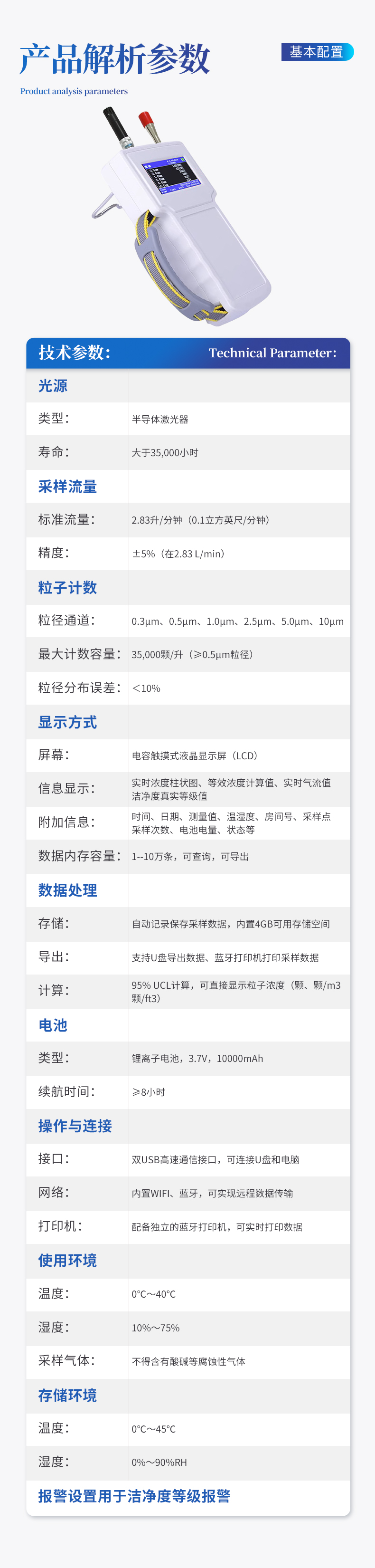 粒徑通道:0.3μm、0.5μm、1.0μm、2.5μm、5.0μm、10μm **計數容量:35,000顆/升(≥0.5μm粒徑) 重復性相對誤差:<10% 粒徑分布誤差:0.5μm粒徑擋分布誤差±30% |