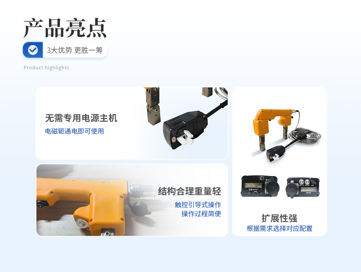 | 1、 無需專用電源主機(jī),電磁軛通電即可使用; | 2、 體積小巧,重量輕; | 3、 開模制作,結(jié)構(gòu)合理,手感舒適; | 4、 配專用儀器箱,電源配專用工作腰包 | 5、 逆變交流鋰電池可滿足不方便拖電源線,且需要采用交流磁化的的場所使用。 |
