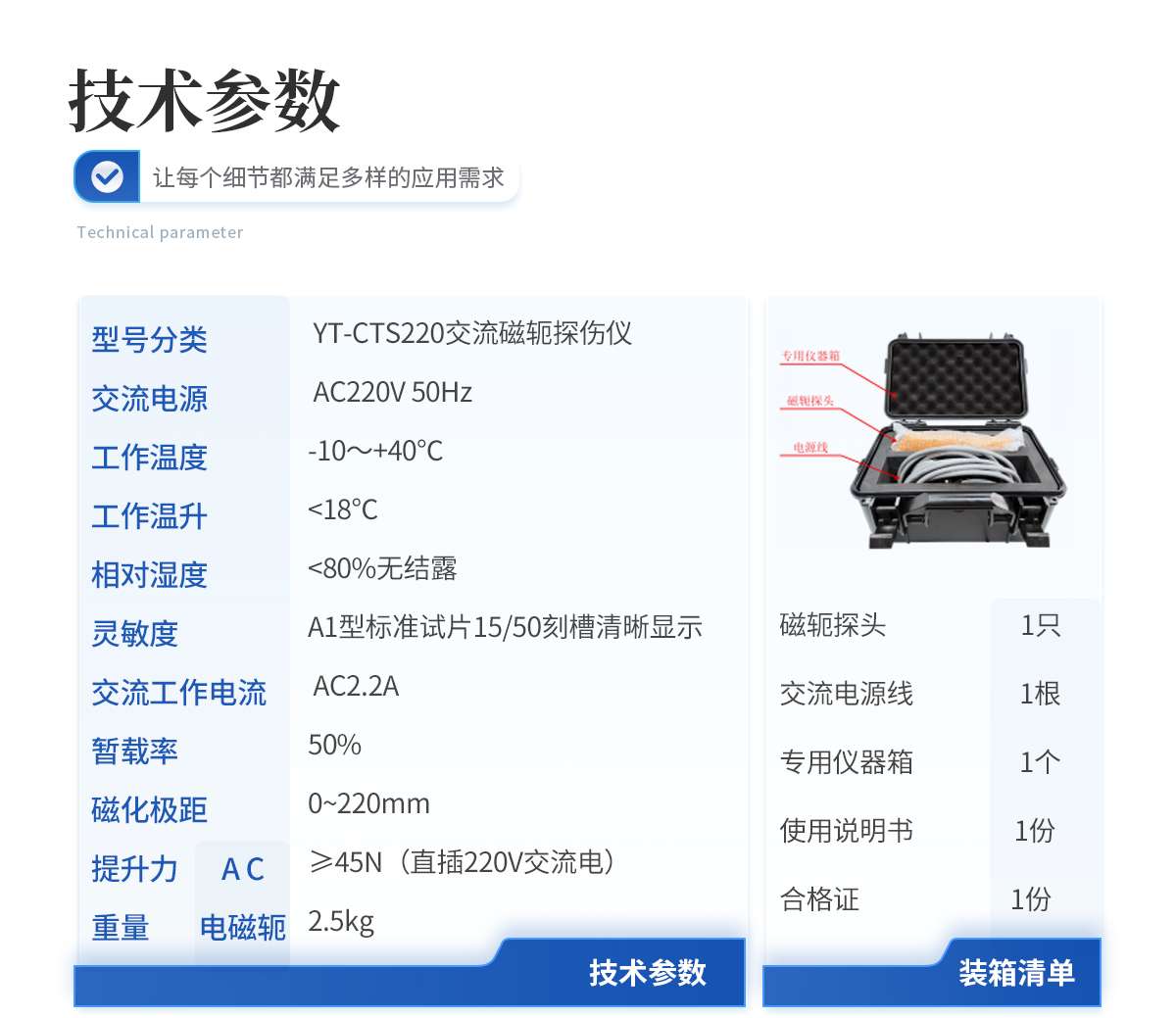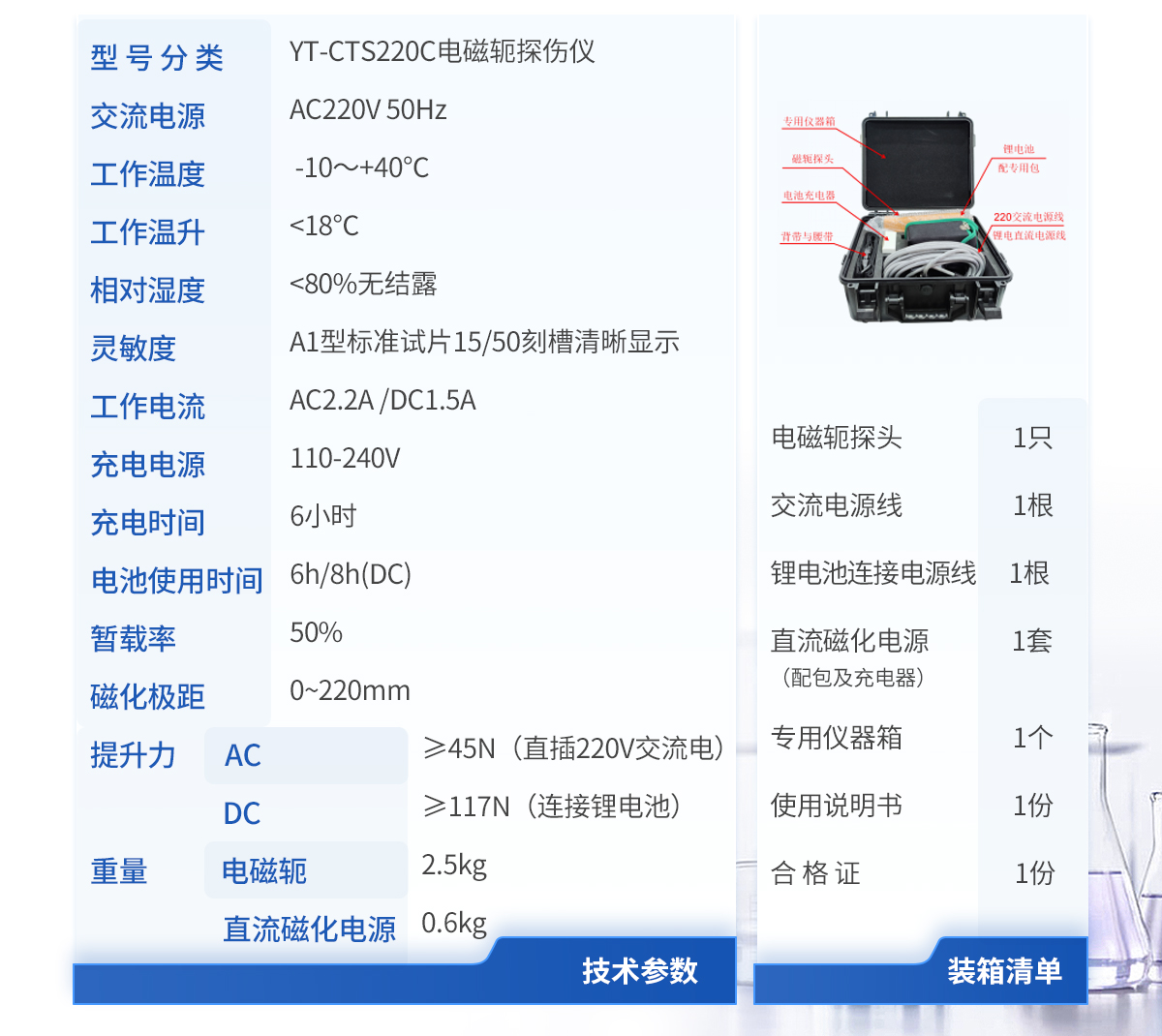 | 1.電磁軛探頭 1 只 | 2.鋰電池連接電源線 1 根 | 3.逆變交流磁化電源(配包及充電器) 1 套 | 4.專用儀器箱 1 個(gè) | 5.使用說明書 1 份 | 6.合 格 證 1 份 |