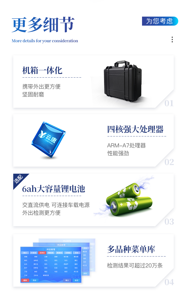 | 隨著人民生活水平的不斷提升,市場對茶葉的把控愈加嚴格。針對現狀,我司專門研發生產--茶葉專用的農藥殘留速測儀;定位茶農、茶商、茶葉企業使用。 此外還可用于果蔬茶生產基地和農貿批發銷售市場現場檢測,餐館、學校、食堂、家庭果蔬加工前的安全速測等。 | 檢測通道: 5個檢測通道,可以同時測試多個樣品,每個樣品由程序控制分別獨立工作,不會互相干擾。 | 顯示方式:≥5英寸液晶觸摸屏顯示,人性化中文操作界面,讀數直觀、簡單。 | 配備嵌入式高速熱敏打印機,可選擇手動打印或者自動打印,三分鐘出打印結果。 | 光源采用進口超高亮發光二極管,具有低功耗、穩定性強、高靈敏度,高檢測精度,高重復性精度,光源可控、響應速度快等優點。 | 采用標準USB接口設計,免驅動安裝,方便數據的存貯和移動,并可隨時與計算機直接相連,并且可用計算機控制儀器。實現數據查詢、瀏覽、分析、統計、打印等。 | 智能化程度高,儀器具有自檢功能:具有開機自檢和調零功能,具有自動檢測重復性功能 | 內置強大的數據庫,可在儀器上直接選擇樣品名稱、檢測指標、送檢單位等信息,也可在儀器上直接編輯錄入樣品名稱、檢測指標、送檢單位等信息并保存進樣品數據庫。 | 支持Wifi網絡,數據可局域網和互聯網數據上傳,檢測結果直接傳至食品安全監管平臺。進行區域食品安全監管及大數據分析處理,檢測區域食品安全長短期動態,達到食品安全問題預估、預警 |