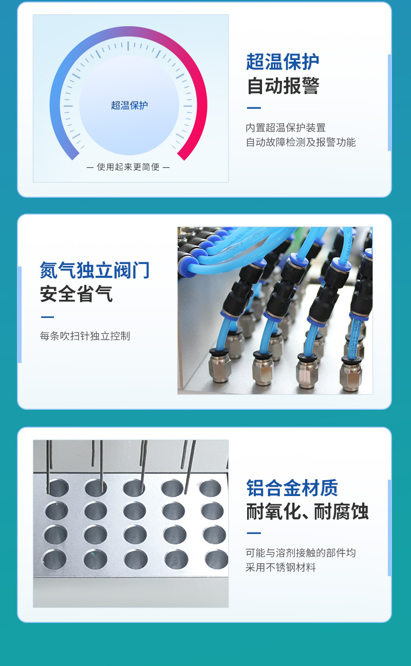 | 分配室上各氣針通道可組合使用或單獨使用,每一路氣針均可單獨開關(guān)。分配室的高度可視需要調(diào)節(jié)。 | 每一路氣體流量可單獨進行調(diào)節(jié),克服了不可調(diào)氮吹儀各氣路氣流量大小不一的弱點。 | 數(shù)字溫控器,雙數(shù)字顯示. | 可能與溶劑接觸的部件均采用不銹鋼材料、合金鋁并表面進行塑料噴涂,使用壽命長且清潔方便。 | 整機可放入通風(fēng)櫥中使用。 | 一般標(biāo)配的加熱塊規(guī)格為孔徑∮16mm。 |
