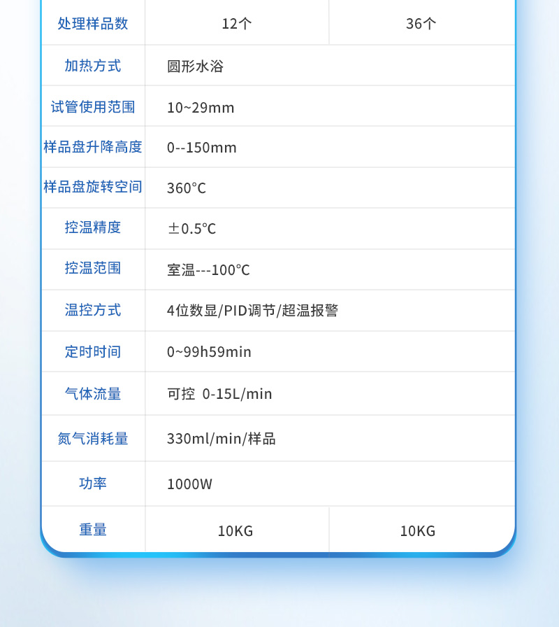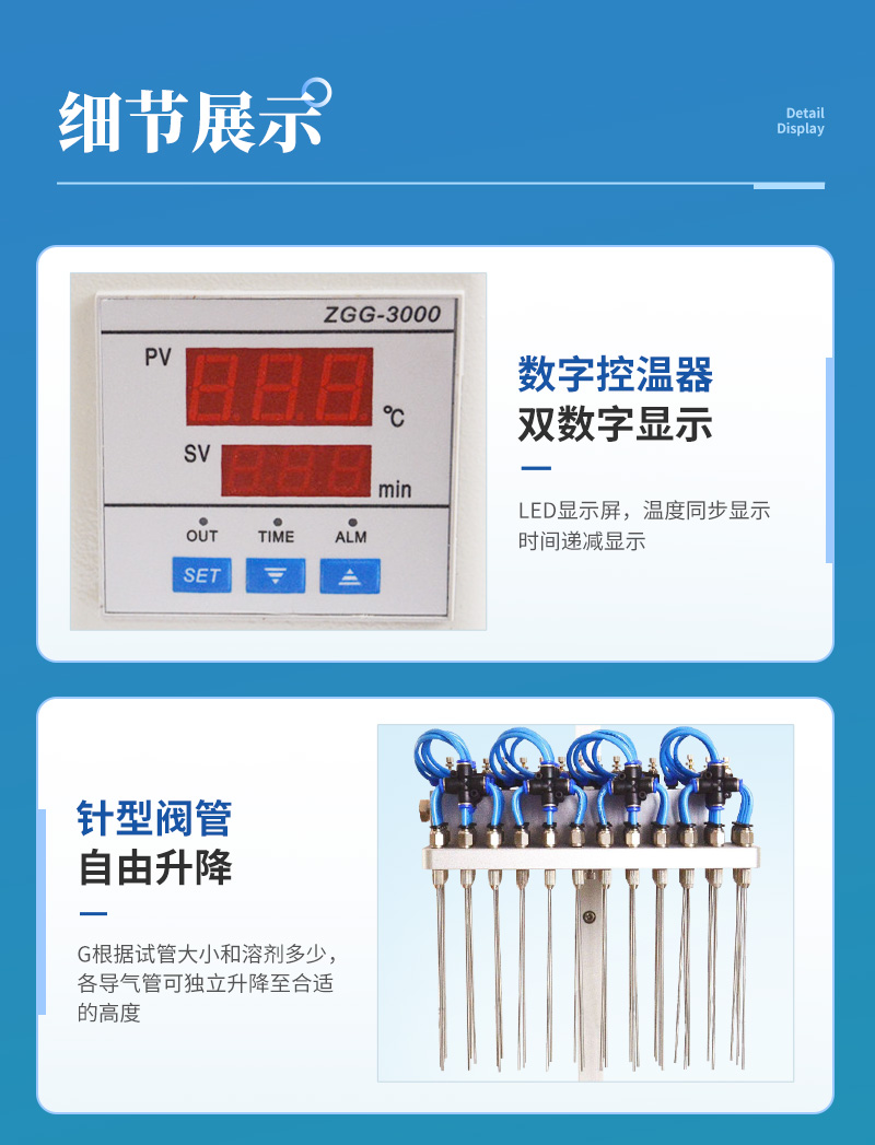 | 每個吹針都可以獨立控制,避免引起交叉污染。 | 儀器氣腔高度可以自行調(diào)節(jié),配備標(biāo)準(zhǔn)氣針長度為15厘米。 | 氮吹儀有36個氣道控制開關(guān),節(jié)約氣體,每根吹氣針的位置可獨立改變吹掃位置,使之適用不同的樣品容器及不同的樣品位置 | 在濃縮有毒溶劑時,整個系統(tǒng)可置于通風(fēng)柜中,降低危險。 | 內(nèi)置超溫保護(hù)裝置,自動故障檢測及報警功能,方便實用。 | 儀器有LED顯示屏,溫度同步顯示、時間遞減顯示,可時時觀察溫度變化。 | 具有整體溫度更均勻,加熱速度快 | 本產(chǎn)品還可以作為普通的干式恒溫器使用 | 使用起來更簡便,而且溫度也可以達(dá)到150℃,可以更好濃縮樣品 |