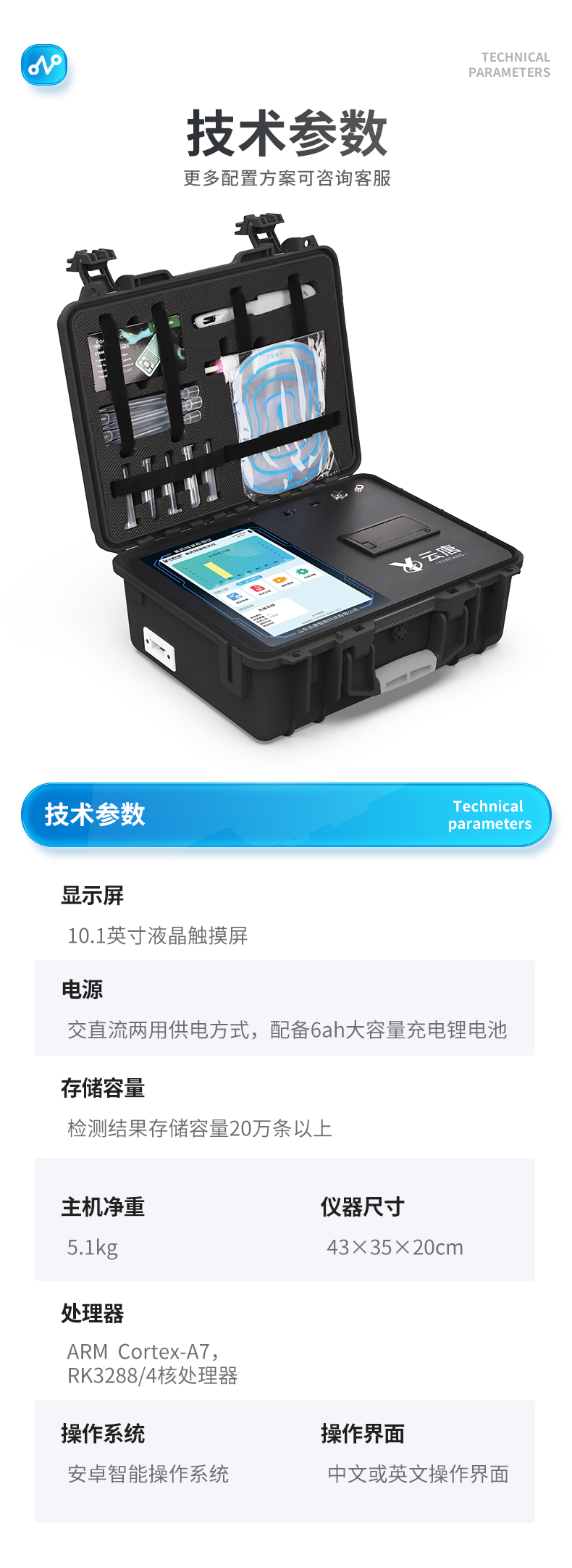 | 1、儀器采用10.1英寸液晶觸摸屏顯,搭配運行安卓智能操作系統,主控芯片采用ARM Cortex-A7,RK3288/4核處理器,主頻1.88Ghz,運轉速度更快速,性能更強。 | 2、儀器功能包括:膠體金檢測模塊、數字化管理模塊、無線通訊模塊等,可以滿足同一軟件下實現所有檢測項目的檢測,并在同一窗口展示檢測結果。 | 3、一體化便攜式快檢設備,采用交直流兩用供電方式,可連接車載電源,配備6ah大容量充電鋰電池,可以滿足現場及流動檢測使用的需求。儀器尺寸:43×35×20cm, 主機凈重:5.1kg | 4、系統自帶數據集成模塊,設備首頁自動統計檢測數據包含:周檢測數據、月檢測數據,全部檢測總數量,均包含檢測總數,合格數,不合格數,以及相關柱形分析圖,對各項檢測數據清晰掌握,無需電腦查詢,更加快捷直觀。 | 5、儀器具有任務預設模塊,可在樣品送檢前提前預設樣品名稱、檢測指標、送檢單位等信息,樣品送檢時一鍵調取保存信息,檢測更加方便快捷。 | 6、膠體金檢測模塊: 軌道式自動傳輸掃描方式,可實時顯示金標卡實時圖像,系統自動分析并呈現出CT曲線圖,CT線自動識別,無需手動調整,完成檢測后自動退出檢測卡。 結果判定線可修改,對照值標定值可保存,斷電不丟失數據。 兼容市場上其他膠體金卡,使用耗材不受限制,極大增強用戶使用體驗。 | 7、圖像調整功能:可根據金標卡讀取圖像進行多方位調整,使其更精準讀取結果。 | 8、儀器檢測系統擁有龐大數據庫,并且構建了完善的檢索、修訂功能。食品庫涵蓋多種樣品名稱,可按需添加或刪除、編輯樣品名稱;產品數據庫以及歷史檢測記錄支持一鍵檢索功能。 | 9、系統打印自定義化,打印格式多樣化,產品合格證(國家標準要求),二維碼,抽樣信息、檢測信息,受檢信息、復核信息、抽樣日期、檢測日期等信息結果,可按需求自行設置打印內容。 | 10、A4紙版本報告打印功能:設備擁有兩種結果展示方式,可以自動生成A4打印模板和小票打印模板兩種樣式,可通過WiFi及網線等方式鏈接外置打印機可進行打印 | 11、儀器具有 wifi 聯網上傳、RJ45網線連接功能,可以快速上傳數據。同步對接監管平臺,數據可局域網和互聯網數據上傳,檢測結果直接傳至食品安全監管平臺。進行區域食品安全監管及大數據分析處理與數據統計,檢測區域食品安全長短期動態,達到食品安全問題預估、預警。 | 12、設備支持U盤存儲,標準USB接口,免驅動安裝。檢測結果存儲容量20萬條以上,可生成Excel表格,進行一鍵拷貝,并具有登錄保護功能,可設置用戶名及密碼,規范不同人員操作權限,防止非工作人員操作,并且可以進行重新校準、鎖定、恢復出廠設置功能。儀器固件可升級,后期檢測項目可擴充。 | 13、儀器具備遠程升級功能,可定向分客戶分儀器更新,開機后自動更新,并可持續性免費更新系統版本,無需像傳統產品返廠更新,節省時間及人力成本并避免了物流運輸返廠升級導致設備損壞的潛在風險。 |