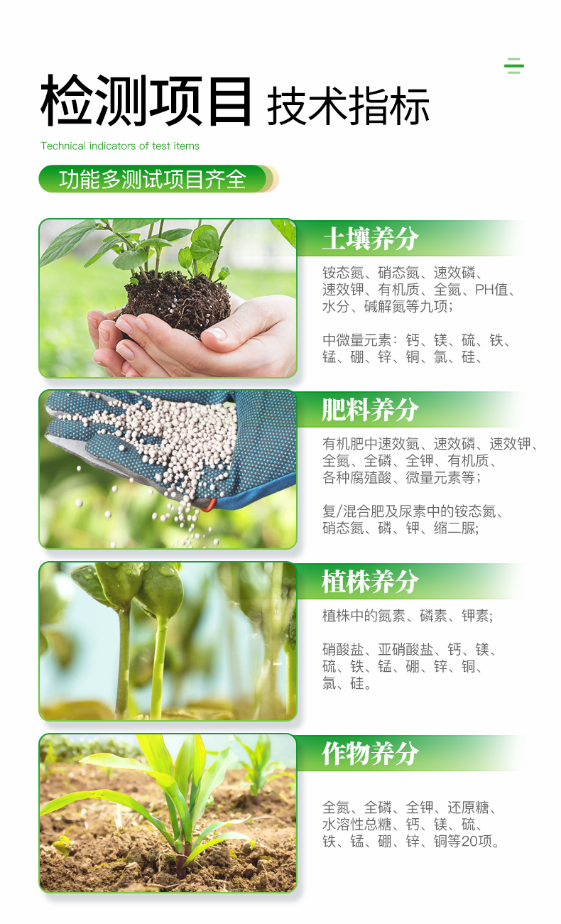 有機肥養分:● 有機肥中速效氮、速效磷、速效鉀、全氮、全磷、全鉀、有機質,各種腐植酸、微量元素(鈣、鎂、硫、鐵、錳、硼、鋅、銅、氯、硅、鉬)等以及各種重金屬(鉛、鉻、鎘、汞、砷、鎳、鋁、氟、鈦、硒)。