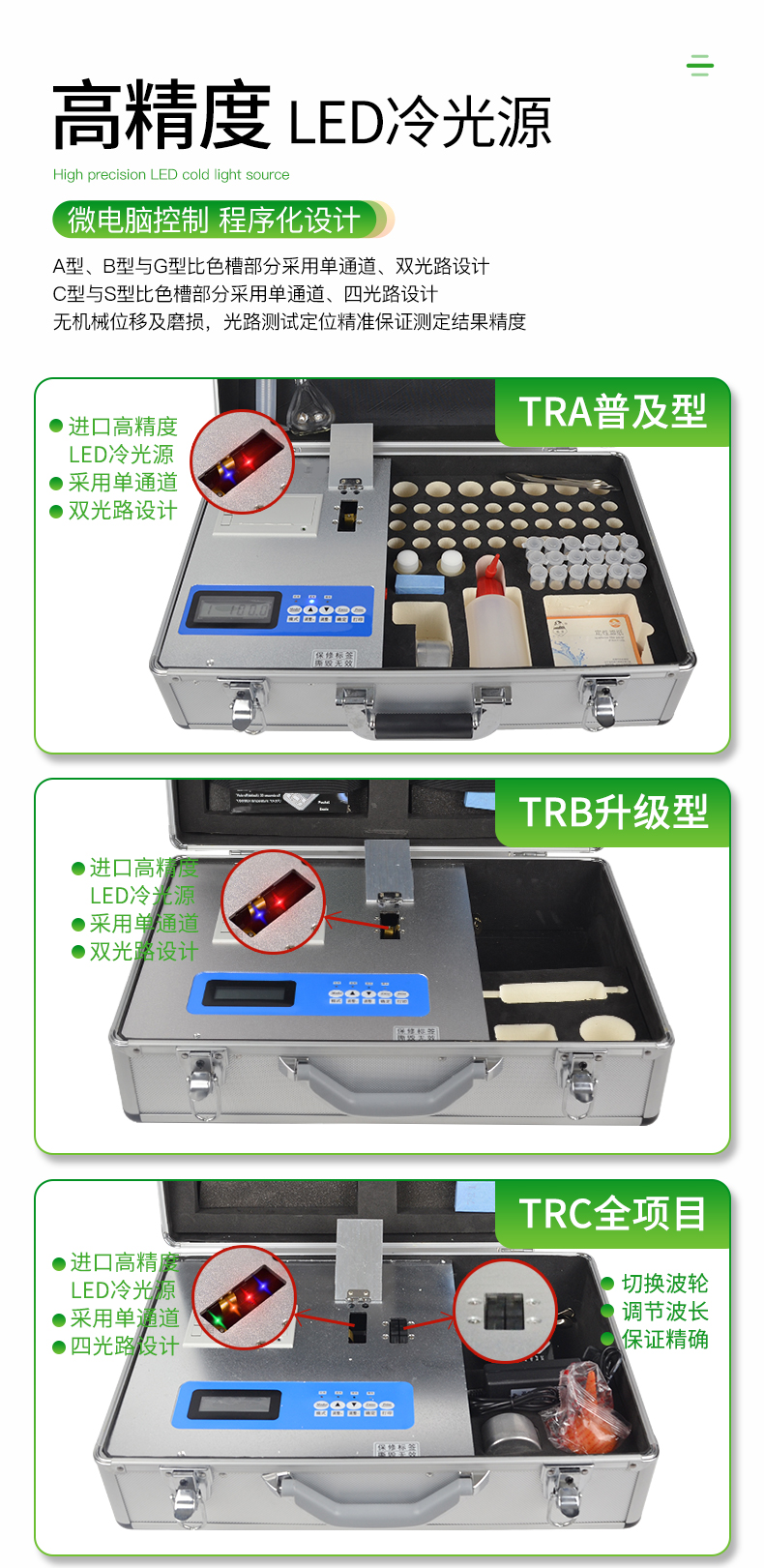 ★采用高亮LED光源,濾光式處理,保證光源波長穩定, 硅半導體作為信號接收系統, 壽命長達10萬小時級別。光源穩定,重現性好,準確度高。