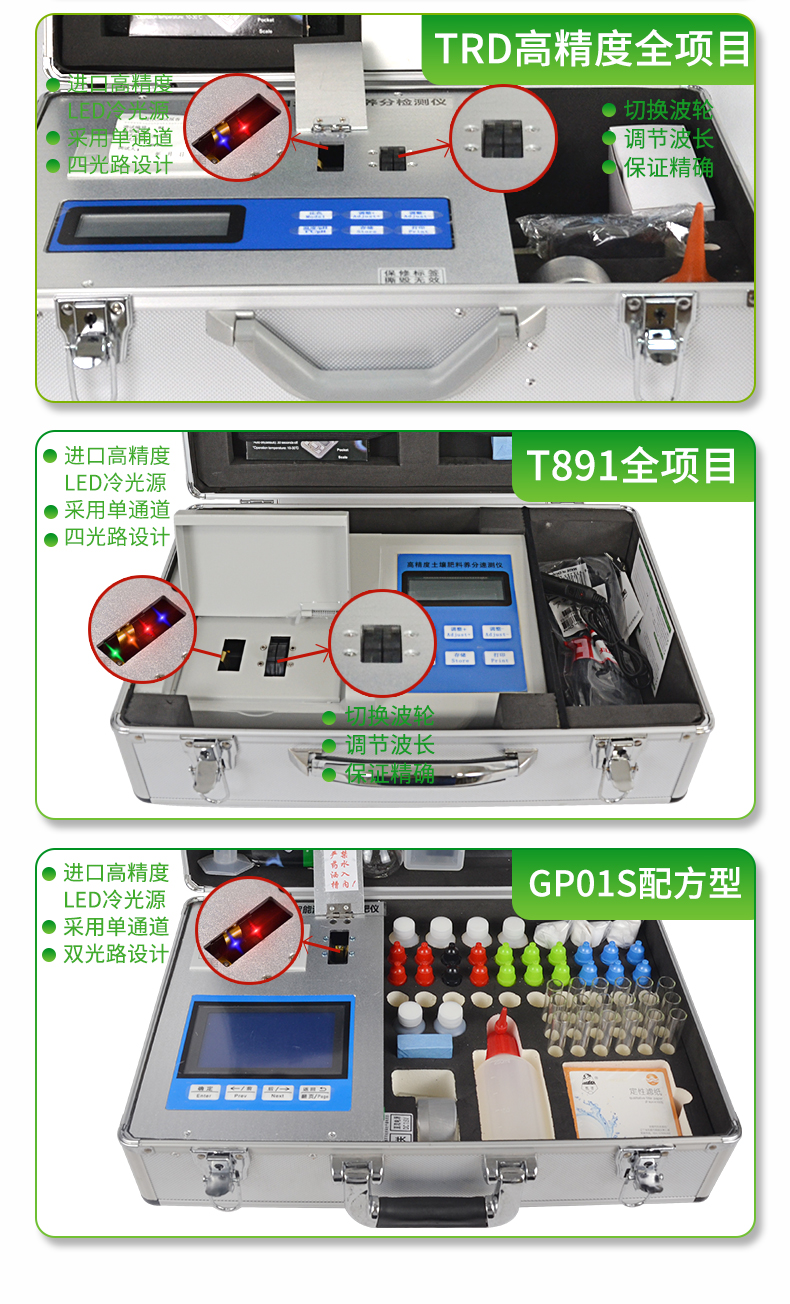配套齊全:該儀器集藥、器、儀為一體,攜帶方便,相當于一個小型實驗室。適于農業服務部門或農資經銷商、肥料廠商測土施肥和鑒別肥料真假。