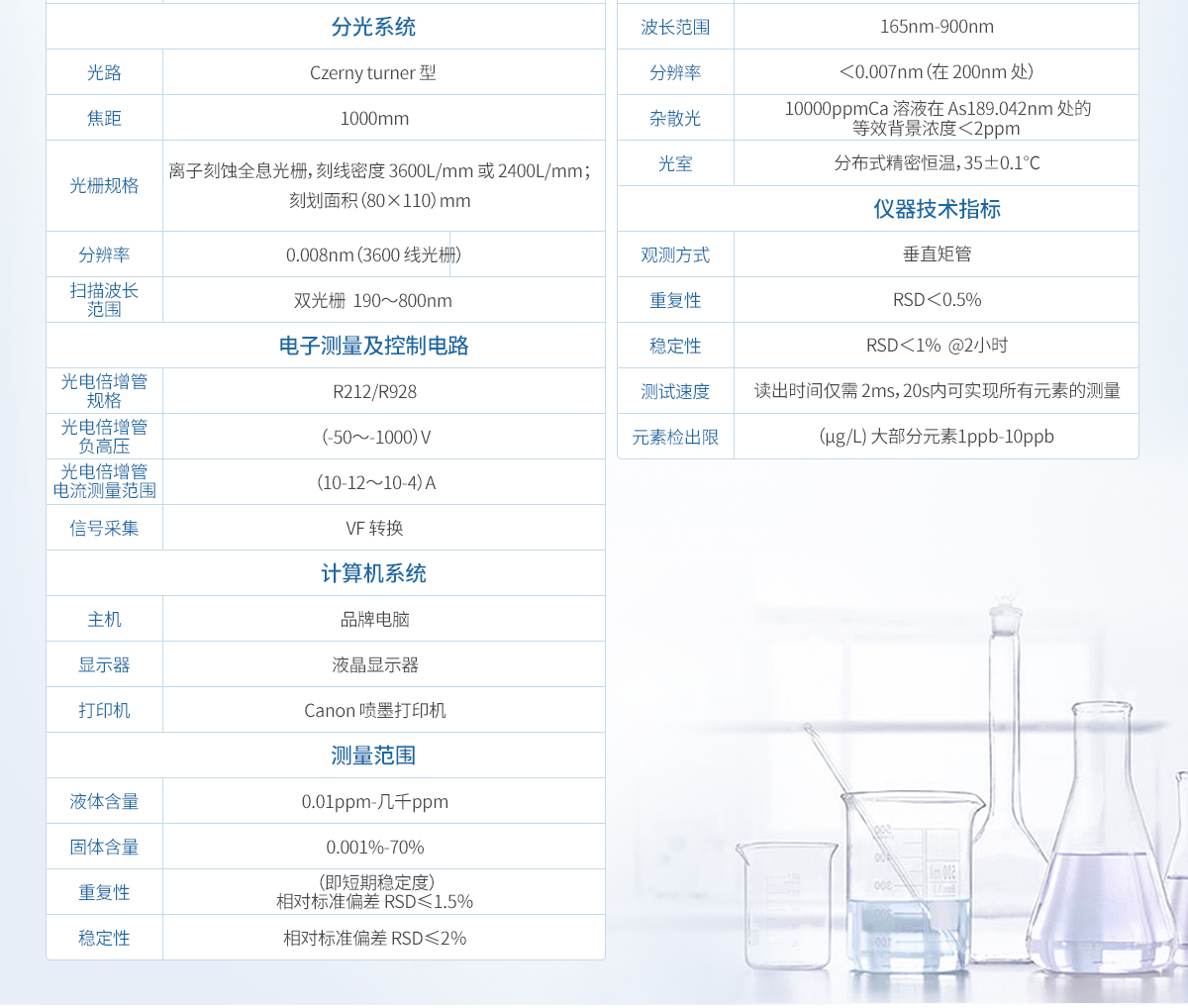 3、光學(xué)系統(tǒng) 3.1 新一代中階梯光柵及棱鏡作為分光元件,內(nèi)部無活動(dòng)部件,光學(xué)穩(wěn)定性好。 3.2 恒溫光學(xué)系統(tǒng),所有光學(xué)元件均密封于恒溫光室中,主機(jī)與光室隔離式設(shè)計(jì)。光室內(nèi)部 精密恒溫 36℃±0.1℃,氬氣吹掃。 3.3 光路焦距:440mm,全反射成像光路,石英棱鏡二維色散系統(tǒng)。 3.4 光學(xué)系統(tǒng)波長范圍:165-900nm,全波長覆蓋。 3.5 波長校正: 每次點(diǎn)火,軟件自動(dòng)采用 C、N、Ar 等空氣元素譜線進(jìn)行譜峰位置校正,保 證分析波長的正確性,無須波長校正溶液。 3.6 吹掃型光室:對(duì) 189nm 以下波長測定,可選擇氬氣或氮?dú)膺M(jìn)行光路吹掃。 3.7 雜散光:≤2.0mg/L(10000mg/L Ca 溶液在 As 188.980nm 處測定)。 3.8 光學(xué)分辨率:≤0.007nm(在 200nm 處)。
