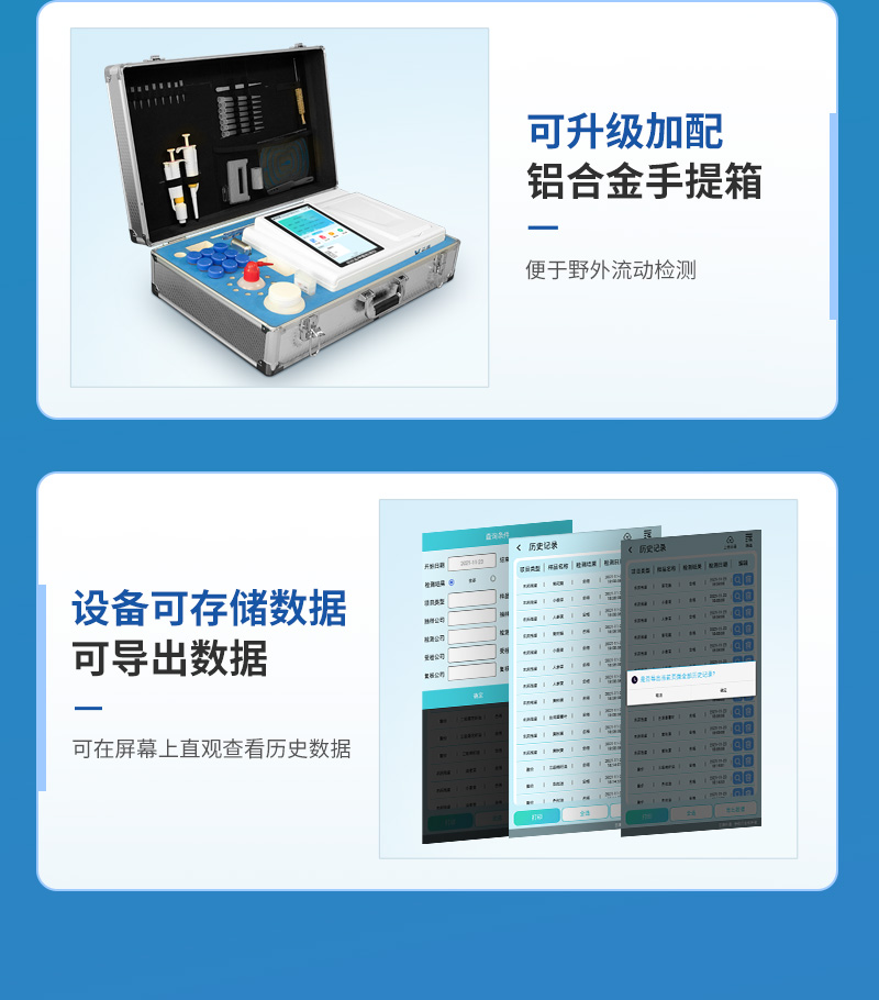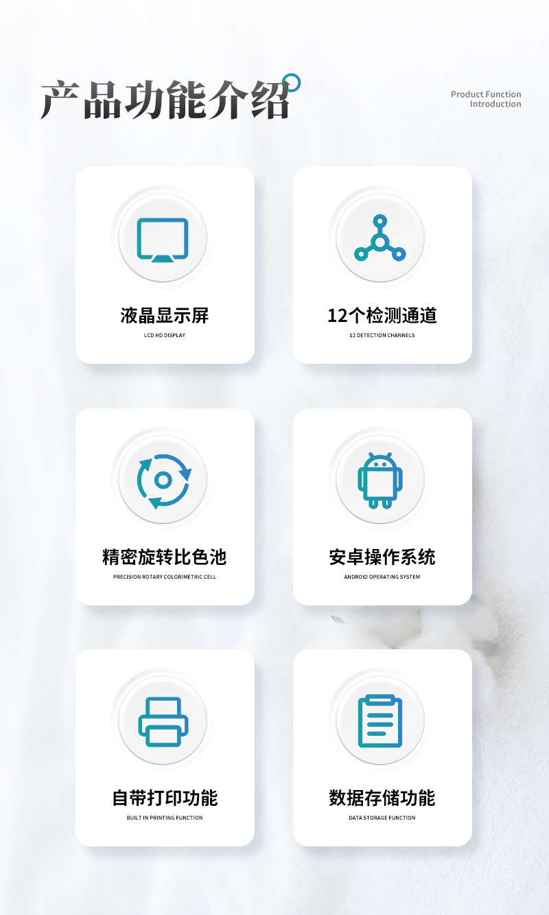 | 該儀器采用ARM Cortex-A7,RK3288/4核處理器,搭配運行安卓智能操作系統,集實驗操作,分析結果,打印報告等功能于一體,使用方便,性能更強。 | 儀器采用7.1英寸液晶觸摸屏,單機即可操作,無需連接外部顯示設備或控制裝置。 | 設備具有12個檢測通道,可一次性檢測11個樣品,效率更高。 | 儀器采用精密旋轉比色池設計,使用同光源校準精度,檢測結果更為準確**。 | 設備具有數據存儲功能,設備可以存儲數據100000組,可在屏幕上直觀查看歷史數據,可導出數據。 | 設備自帶打印功能,可對樣品信息及檢測結果無限次隨意打印。 | 該儀器模塊化高度集成,同步設有數字化管理模塊、無線通訊模塊,可將檢測結果進行分析,直接上傳至數據平臺,實現數據共享,方便后期進行數據分析與統計。 | 儀器采用高度智能化系統,儀器自動對檢測結果與國標限量值進行對比,自動判定樣品是否合格,結果更為直觀。 | 本設備可以針對檢測樣品信息,對每個通道屬性單獨進行編輯,例如受檢單位,檢測人員等。 | 設備具有過壓保護、防靜電干擾、防磁場干擾等功能 | 該設備可進行技術性遠程升級,更新程序,無需返廠,并且后期我司將持續免費更新系統版本,降低使用成本及運輸損耗風險。 |