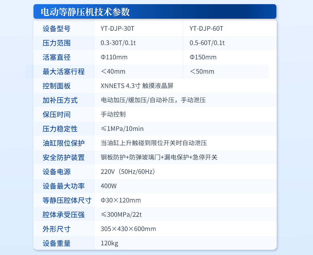 | 規格型號:YT-ZJP-30T | 壓力范圍:0.3-30T/0.1t | 活塞直徑 :Φ110mm | **油缸行程:<30mm | 加壓方式:自動加壓/緩加壓 | 加壓制樣過程:自動加壓--自動保壓--精準補壓--定時泄壓 | 加壓段數:5段任意設置 | 保壓時間 :不限時N秒,每段均可設置不同的保壓時間 | 控制面板:XNNETS 7寸 觸摸液晶屏(遠程控制可選配) | 觸屏功能模塊:壓力系-統-數據管理系統--中英文界面互換等(USB可升級) | 模具壓強換算:實時自動計算樣品承受壓強(MPa) | 油缸限位保護:當油缸上升觸碰到限位開關時自動泄壓 | 系統安全配置:當系統壓強超過安全值時自動泄壓 | 安全防護裝置:鋼板防護+防彈玻璃門+漏電保護+急停開關 | 設備電源:220V(50Hz/60Hz) | 設備**功率:400W | 等靜壓腔體尺寸:Φ30×150mm | 腔體承受壓強:≤300MPa/22t | 外形尺寸:240×390×560mm | 設備重量:120kg | 配置說明:等靜壓機1臺!可根據需求定制500MPa等靜壓機或橡膠模具 |