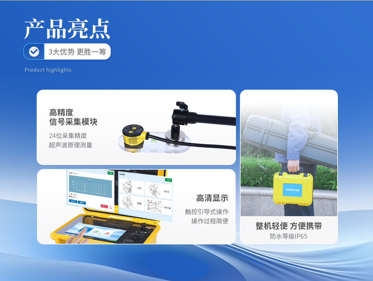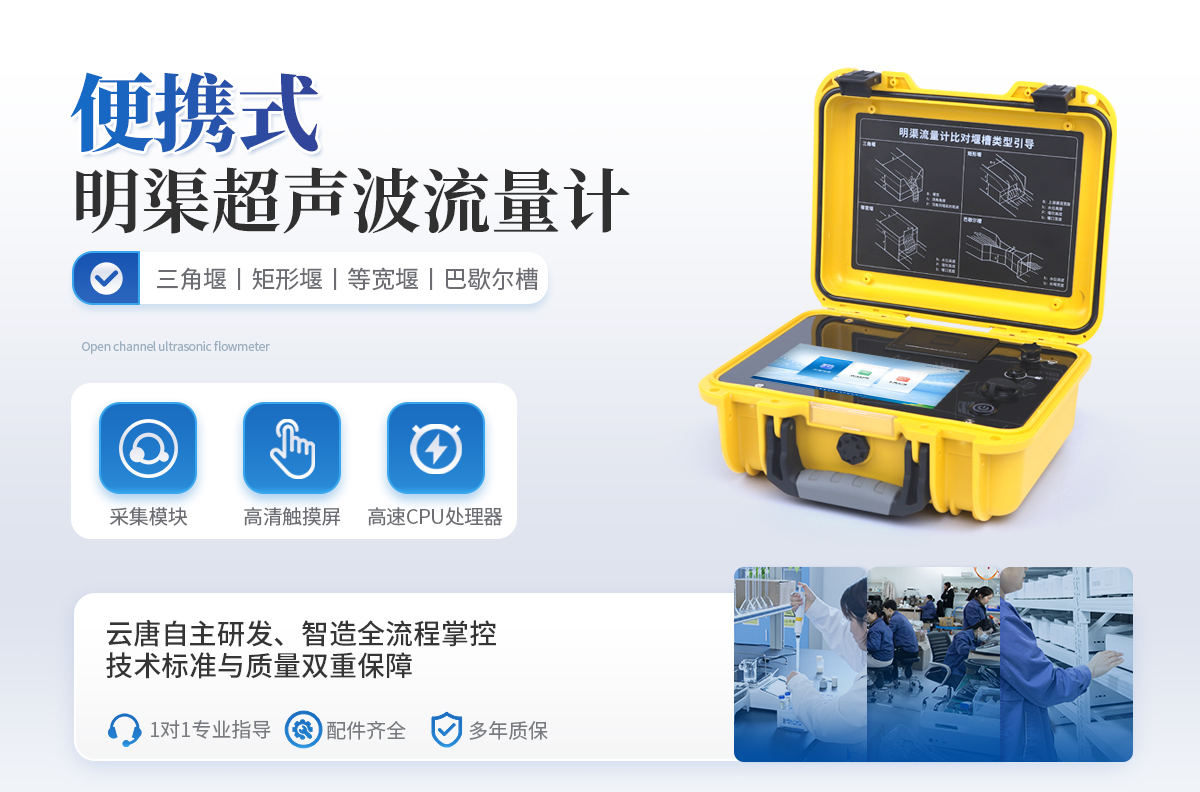 適應于四種基本堰型:三角堰、 矩形堰、 等寬堰、 巴歇爾槽 高精度信號采集模塊,24 位采集精度,測量數據真實有效 大屏幕彩色液晶觸摸屏,觸控引導式操作,操作過程簡便 曲線顯示流量變化趨勢及液位變化趨勢 友好的人機交互界面,圖文結合,即可對儀器進行操作 儀器帶有微型打印機,可現場直接打印測量數據 可與電腦連接,將測量數據輸出至電腦,便于用戶對數據進行統計分析 可存儲 50000 次的測量歷史記錄 內含大容量鋰電池,一次充電可連續測量 72 小時 流量計內置智能化電源管理系統,延長電池使用壽命 開機密碼進入,有效保護測量比對數據及結果 手提箱式設計,整機重量輕,方便用戶攜帶 具有USB數據導出和打印機數據打印功能 可選配GRS或北頭定位功能