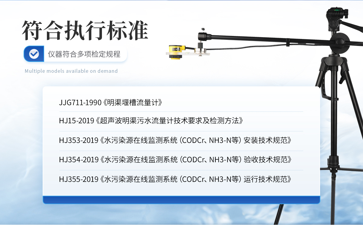 JJG711-1990《明渠堰槽流量計》; HJ15-2019《超聲波明渠污水流量計技術要求及檢測方法》; HJ353-2019《水污染源在線監測系統(CODCr、NH3-N等)安裝技術規范》; HJ354-2019《水污染源在線監測系統(CODCr、NH3-N等)驗收技術規范》; HJ355-2019《水污染源在線監測系統(CODCr、NH3-N等)運行技術規范》;