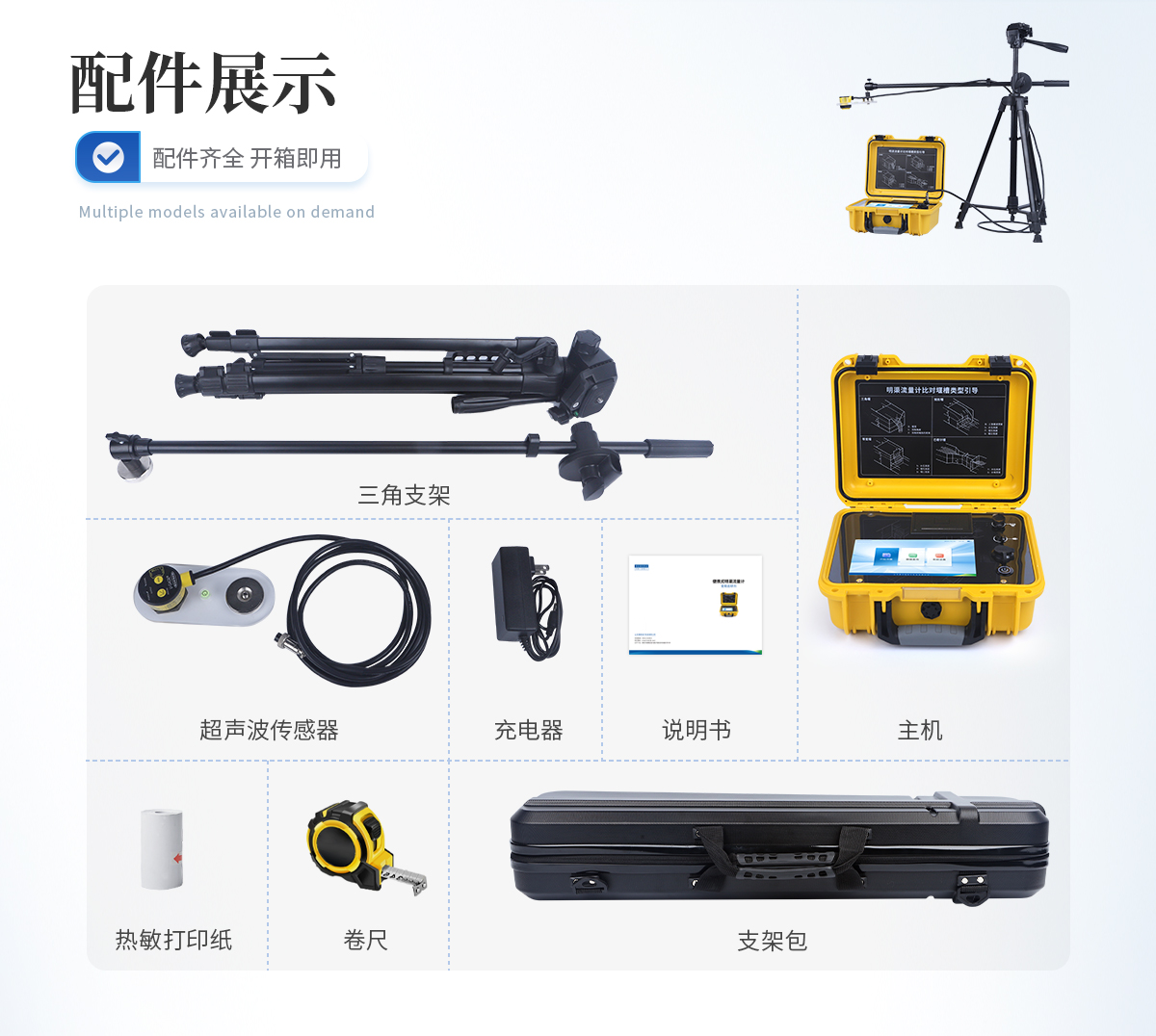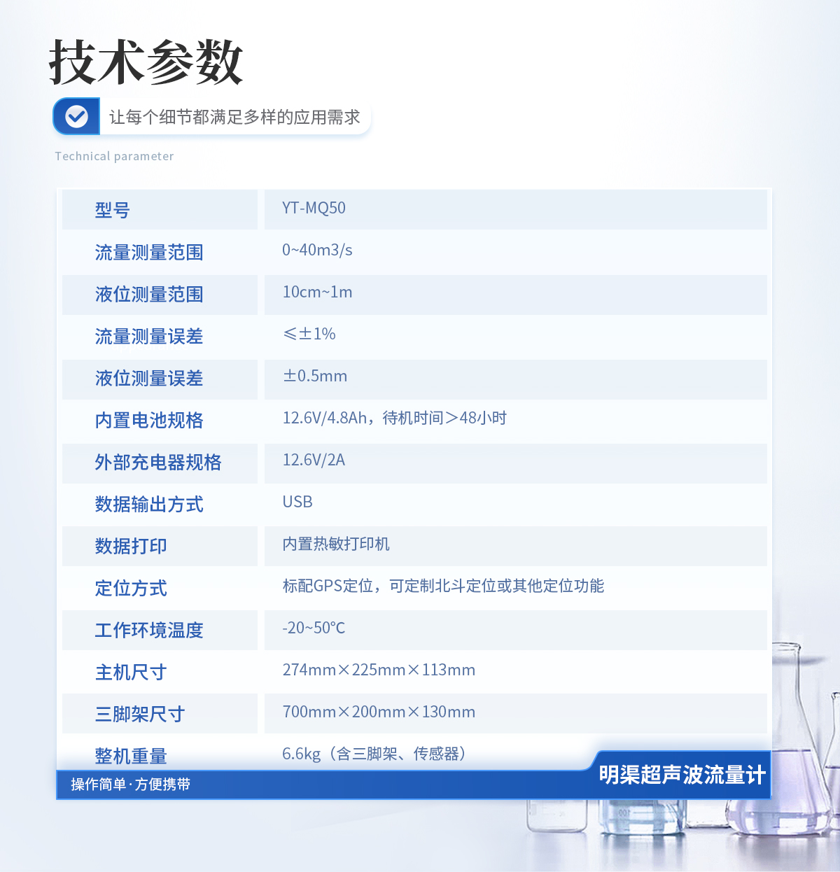 1.流量測量范圍:0~40m3/s; 2.液位測量范圍:10cm~1m; 3.流量測量誤差:≤±1%; 4.液位測量誤差:±0.5mm; 5.內置電池規格:12.6V/4.8Ah,待機時間>48小時; 6.外部充電器規格:12.6V/2A; 7.數據輸出方式:USB; 8.數據打印:內置熱敏打印機; 9.定位方式:標配GPS定位; 10.工作環境溫度:-20~50℃ 11.主機尺寸:274*225*113mm; 12.三腳架尺寸:700*200*130mm; 13.整機重量:6.6kg(含三腳架、傳感器);