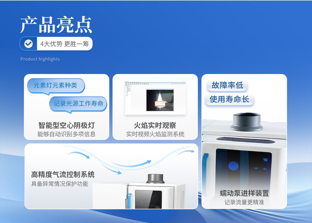 標準曲線的制作只需一個**濃度點的標準溶液,儀器可進行高濃度樣品自動稀釋、自動清洗管路等功能,極大地節省了標準樣品制備時間和使用成本。 5、火焰實時觀察