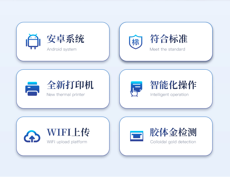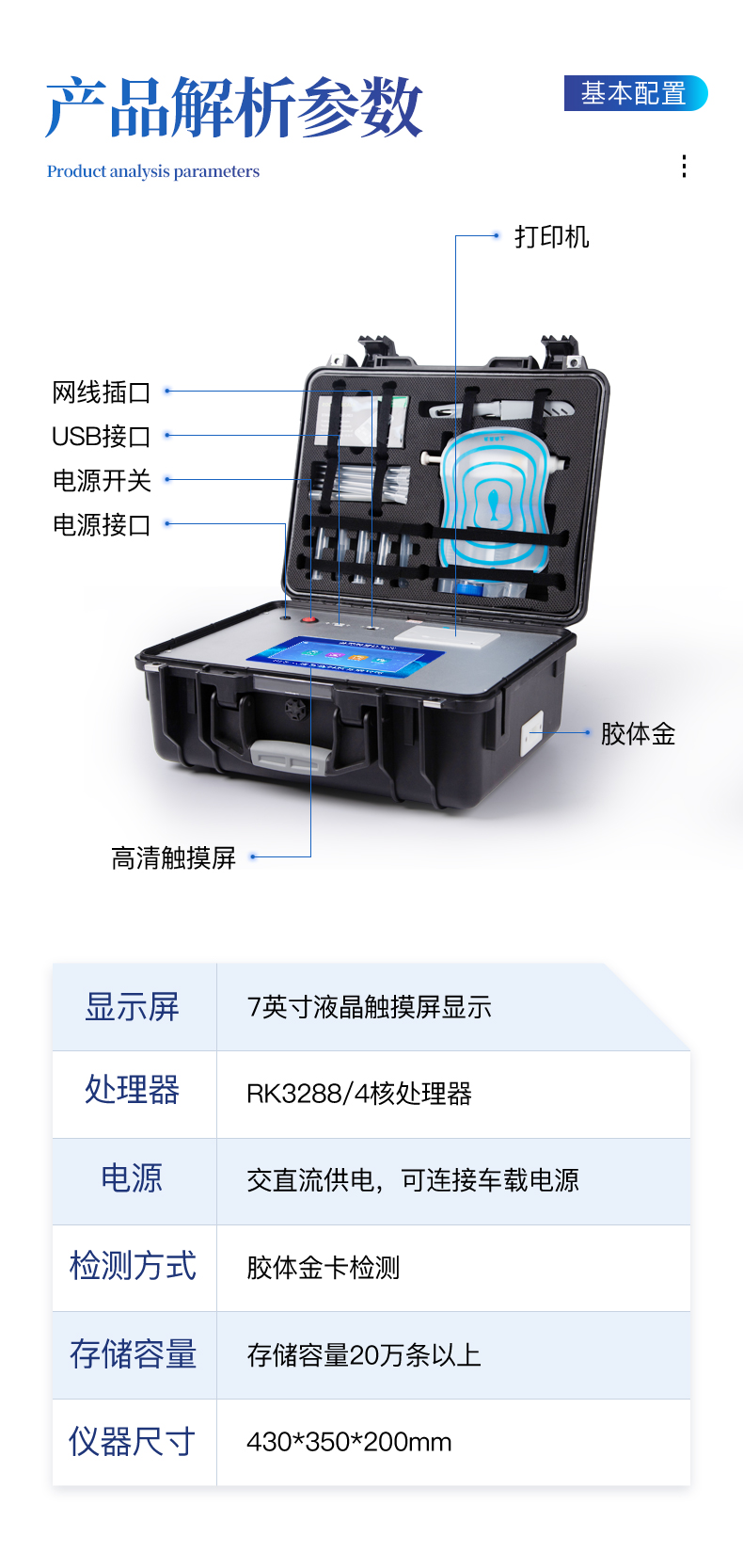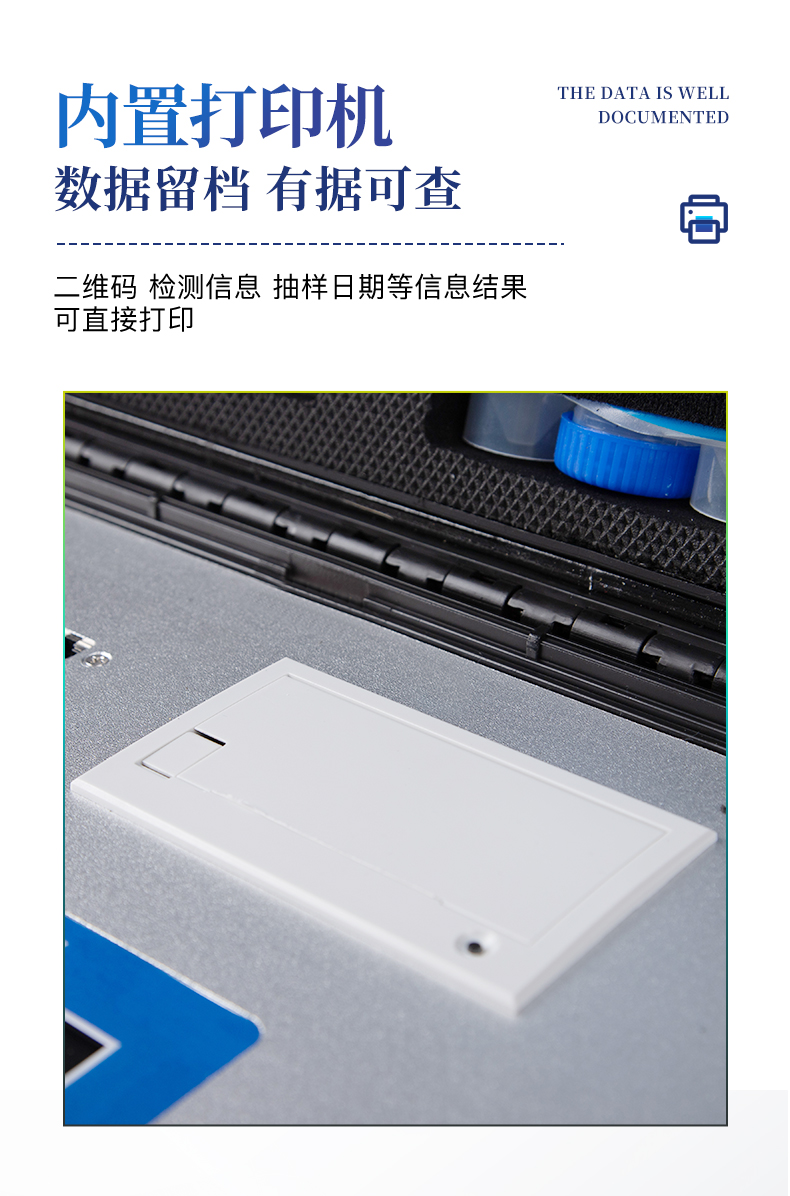 | 安卓智能操作系統(tǒng),采用更加**UI交互界面,儀器具有wifi聯(lián)網(wǎng)上傳、4G聯(lián)網(wǎng)傳輸、GPRS無線遠傳、網(wǎng)線連接功能,快速批量上傳數(shù)據(jù)。 | 智能化程度高,儀器具有自檢功能:具有開機自檢和調(diào)零功能,具有自動檢測重復性功能。 | 新一代高速熱敏打印機,檢測完成可自動打印檢測報告和二維碼。 | 儀器帶有監(jiān)管平臺,數(shù)據(jù)可局域網(wǎng)和互聯(lián)網(wǎng)數(shù)據(jù)上傳,檢測結(jié)果直接傳至食品安全監(jiān)管平臺。進行區(qū)域食品安全監(jiān)管及大數(shù)據(jù)分析處理與數(shù)據(jù)統(tǒng)計,檢測區(qū)域食品安全長短期動態(tài),達到食品安全問題預估、預警 | 一體化便攜式快檢設(shè)備,滿足現(xiàn)場及流動檢測使用需求,能夠在同一軟件下實現(xiàn)所有檢測項目的檢測,并可通過同一窗口直觀顯示檢測結(jié)果。 | 膠體金模塊檢測方式:軌道式自動傳輸掃描,檢測完成后自動退出檢測卡。 | 一體化主機,包含食品安全檢測模塊、多通道農(nóng)藥殘留檢測模塊、膠體金免疫層析檢測模塊。 | CT線自動識別,無需手動調(diào)整。 | 儀器具有品類多種類樣品菜單庫,可靈活選擇檢測樣品,不同的檢測通道可同時檢測不同的樣品項目。。 | 樣品處理簡單省力,整體操作快速、安全、便捷。 | 儀器具有自身保護功能,可設(shè)置用戶名及密碼,防止非工作人員操作等。 | 高靈敏度,高檢測精度,高重復性精度,掃描式高精度光學傳感器。 | 儀器具有重新校準、鎖定、恢復出廠設(shè)置功能。 | 內(nèi)置強大的數(shù)據(jù)庫,可在儀器上直接選擇樣品名稱、檢測指標、送檢單位等信息,也可在儀器上直接編輯錄入樣品名稱、檢測指標、送檢單位等信息并保存進樣品數(shù)據(jù)庫。 | 儀器具有重新校準、鎖定、恢復出廠設(shè)置功能。 | 結(jié)果判定線可修改,對照值標定值可保存,斷電不丟失數(shù)據(jù)。 | 兼容市場上所有的膠體金卡,使用耗材不受限制,極大增強用戶使用體驗。 |