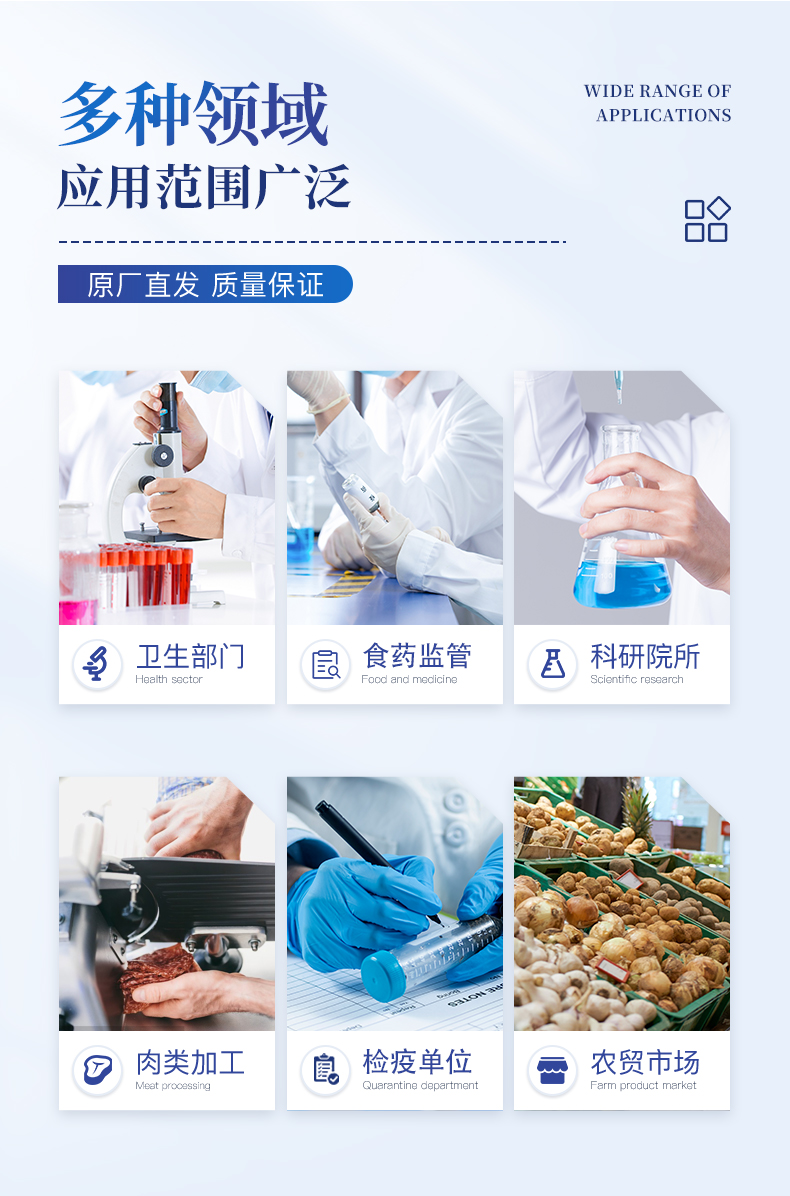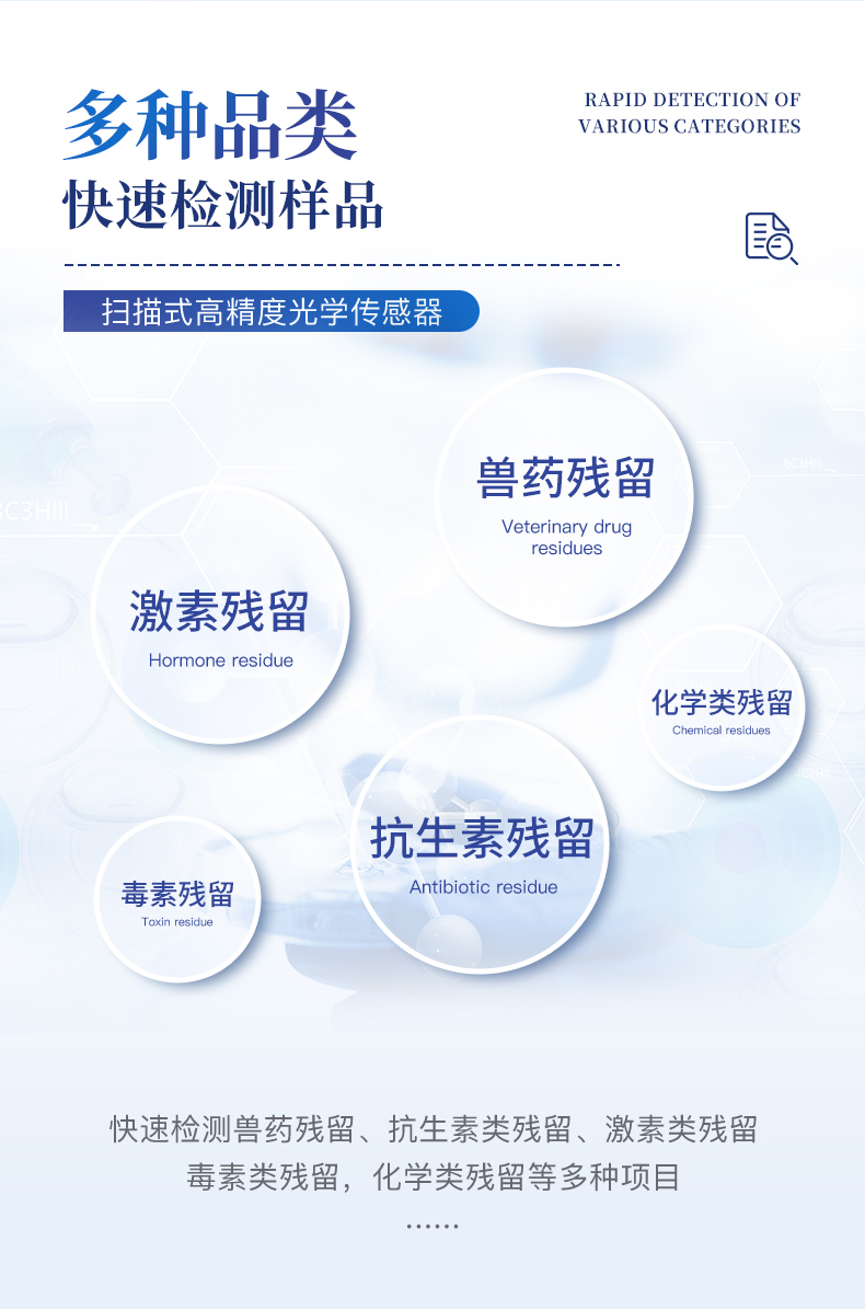 | 瘦肉精激素類(獸藥):鹽酸克倫特羅、沙丁胺醇、萊克多巴胺、己烯雌酚、喹乙醇等 | 抗生素殘留類(獸藥):四環(huán)素類、硝基呋喃類、磺胺類、沙星類、喹諾酮類、慶大霉素、鏈霉素、阿莫西林、紅霉素等 | 水產(chǎn)品安全類:孔雀石綠、氯霉素、呋喃妥因代謝、呋喃西林代謝、呋喃它酮代謝、呋喃唑酮代謝等 | 以及病害肉及肉類新鮮度的擴展檢測。 |