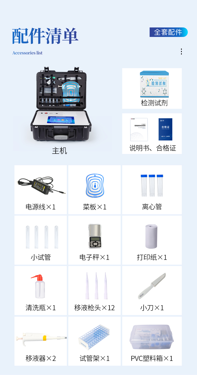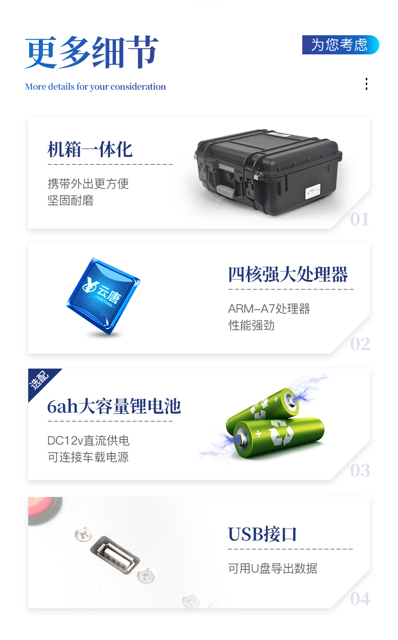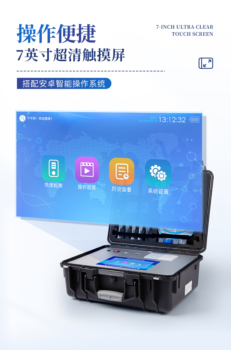 | 主控芯片采用ARM Cortex-A7,RK3288/4核處理器,主頻1.88Ghz,運轉(zhuǎn)速度更快速,穩(wěn)定性更強。 | 顯示方式:7英寸液晶觸摸屏顯示,人性化中文操作界面,讀數(shù)直觀、簡單。 | 交直流兩用,直流12V供電,可連接車載電源,可配6ah大容量充電鋰電池,方便戶外流動測試。 | 四波長冷光源,每個通道均配置410、520、590、630nm波長光源,標配**的光路切換裝置,專利光路切換功能可實現(xiàn)*多64波長,并且所有檢測項目可實現(xiàn)所有通道同時檢測。 | 光源亮度自動調(diào)節(jié)與校準 | 智能恒流穩(wěn)壓,光強自動校準,長時間連續(xù)工作光源無溫漂現(xiàn)象。 | 內(nèi)置新國家限量標準,與所測結(jié)果進行現(xiàn)場比對,并持續(xù)更新標準。 | 不間斷進樣,連續(xù)檢測 | 樣本編號自動累加。 | 數(shù)據(jù)無線上傳平臺,并可從平臺導出為Excel表格。 | 檢測結(jié)果存儲容量20萬條 | 同時支持U盤拷貝,標準USB接口,免驅(qū)動插拔。 | 檢測項目可擴充,固件可升級 | 儀器尺寸:43×35×20cm, 主機凈重:5.2kg |