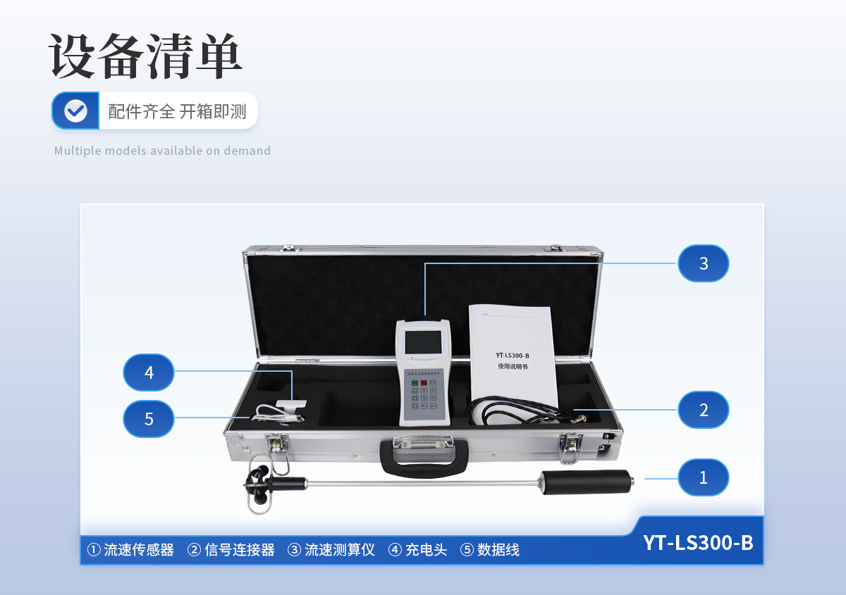 ①流速傳感器、②信號連接器、③流速測算儀、④充電頭、⑤數據線