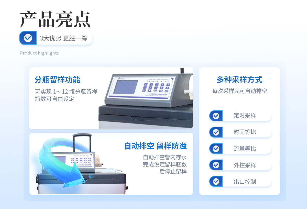 | 節能:**功率190W, 平均功率45W。 用環保的方式完成環保事業。 | 可靠:維護周期≥168h,蠕動泵管等耗品平均使用壽命三年; | 與水接觸的所有容器均為模具加工的耐腐蝕材料; | 與水接觸或可能會意外接觸水的用電設備均為直流24V供電,更好的保護使用者; | 水樣冷藏箱物理鎖與密碼電子鎖并用,雙人雙鎖確保水樣安全; | 多種固定劑添加保障不同因子留存時間更長; | 合理的混勻桶結構,高速攪拌讓水樣混勻更完全,攪拌槳外四氟內304鋼的結構確保不與水 樣發生化學反應; | 智能:斷電保護功能使采樣器在因不可抗力導致采樣器運行中斷電,再次上電時,采樣器所設定的參數不會改變,且能夠恢復到斷電前的工作模式繼續運行; | 簡單:安裝簡單,一人一小時既能完成一臺采樣器的現場安裝; |