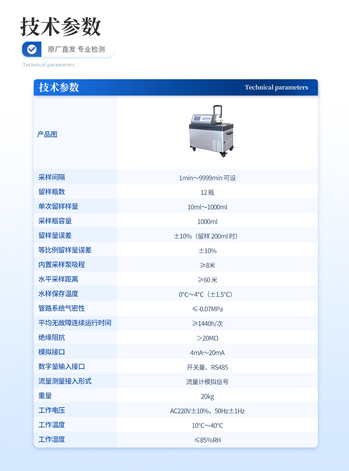| 采樣量誤差:±5% | 等比例采樣量誤差:±10% | 留樣量誤差:±5 % | 等比例留樣量誤差:±10 % | 留樣量重復性:≤3% | 系統時鐘計時誤差:≤10 s/24 h | 冷藏箱溫度控制誤差:±2 ℃ | 模擬量采集誤差:±0.05 mA | 保存劑注入量誤差:±10 % | 采樣垂直高度:≥5 m | 水平采樣距離:≥50 m | 管路系統氣密性:≤-0.08 MPa | *小維護周期:≥168 h |