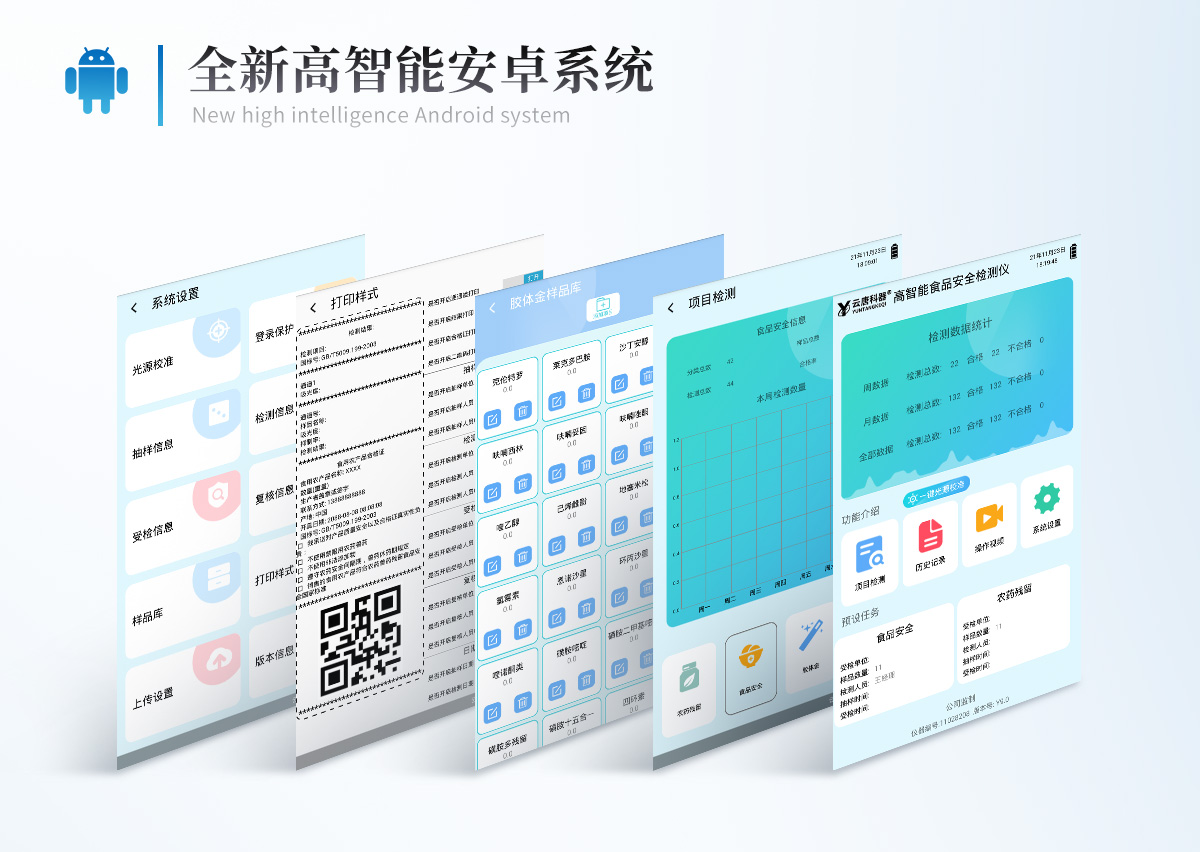 | 儀器采用臺式一體化系統(tǒng)檢測技術(shù),將分光光度模塊、膠體金檢測模塊、新型農(nóng)殘檢測模塊、數(shù)字化管理模塊、無線通訊模塊高度集成于一體,支持檢測200種食品安全檢測項(xiàng)目,同時預(yù)留升級檢測方法。 | 儀器檢測模塊標(biāo)準(zhǔn)化、智能化,可隨意自由組合。檢測箱體內(nèi)置多個標(biāo)準(zhǔn)檢測單元,檢測模塊可以調(diào)整配置。 | 儀器采用全新安卓智能系統(tǒng),主控芯片采用 ARM Cortex-A7,RK3288/4核處理器,10.1寸高清液晶觸摸豎屏,更加**的UI交互界面,運(yùn)轉(zhuǎn)快捷;儀器配備無線通信模塊: 4G(APN)通訊模塊、Wifi模塊,藍(lán)牙傳輸,同時具有雙USB接口以及RJ45接口能以多種方式實(shí)現(xiàn)數(shù)據(jù)保存和數(shù)據(jù)傳輸功能。 | 創(chuàng)新檢測模式: ★檢測通道:≥12通道;采用精密旋轉(zhuǎn)比色池設(shè)計,使用同芯片同光源校準(zhǔn)精度,解決不同光源之間的誤差值。1-12通道間誤差0.1%。(***:**202022821055.2) | ★儀器具有自動識別比色皿檢測功能,即:將樣品比色皿放入儀器后,點(diǎn)擊樣品檢測,儀器自動識別比色皿進(jìn)行通道檢測。 | 進(jìn)口高精光源: 高精度進(jìn)口四波長冷光源,通道配置 410、520、590、630nm 波長光源,一個光源芯片驅(qū)動一個光源,誤差極小,每臺設(shè)備單獨(dú)**校準(zhǔn)光源,**比對,同時參照四種不同波段光源全方位覆蓋市面上99%的農(nóng)殘食品項(xiàng)目檢測。 | 膠體金模塊檢測方式: 采用COMS實(shí)時成像技術(shù),可采集多個畫面,支持3個金標(biāo)同時讀卡,通過不同顏色的灰度變化,一秒精準(zhǔn)得出結(jié)果。 | 智能操作分析系統(tǒng): ★便捷操作系統(tǒng):設(shè)備檢測時可在同一檢測界面自動對應(yīng)相關(guān)檢測通道一次性選擇1-12個樣品名稱,無須退出界面,節(jié)省操作時間。(需提供對應(yīng)證明) | ★數(shù)據(jù)集成系統(tǒng):設(shè)備首頁自動統(tǒng)計檢測數(shù)據(jù)包含:周檢測數(shù)據(jù)、月檢測數(shù)據(jù),全部檢測總數(shù)量,均包含檢測總數(shù),合格數(shù),不合格數(shù),以及相關(guān)柱形分析圖,對各項(xiàng)檢測數(shù)據(jù)清晰掌握,無需電腦查詢,更加快捷直觀。(需提供對應(yīng)證明文件) | ★項(xiàng)目預(yù)設(shè)系統(tǒng):支持添加單個及多個相同或不相同的任務(wù)預(yù)設(shè),一鍵快速調(diào)取,每一個任務(wù)分別可以設(shè)置不同的樣品、批次、編號、來源、備注、抽樣信息、檢測信息、受檢信息、復(fù)核信息等更多信息。無縫鏈接平臺和APP實(shí)時查看下發(fā)任務(wù)。(需提供對應(yīng)證明文件) | ★數(shù)據(jù)監(jiān)管系統(tǒng):同步對接監(jiān)管平臺,數(shù)據(jù)可局域網(wǎng)和互聯(lián)網(wǎng)數(shù)據(jù)上傳,檢測結(jié)果可選擇直接傳至食品安全監(jiān)管平臺。集成OSS輸出存儲服務(wù)、區(qū)分設(shè)備定向管理應(yīng)用,進(jìn)行區(qū)域食品安全監(jiān)管及大數(shù)據(jù)分析處理與數(shù)據(jù)統(tǒng)計,檢測區(qū)域食品安全長短期動態(tài),達(dá)到食品安全問題預(yù)估、預(yù)警。(需提供對應(yīng)食品理化分析系統(tǒng)計算機(jī)軟件著作權(quán))。 | ★自定義打印系統(tǒng):內(nèi)置全新打印系統(tǒng),新創(chuàng)自定義打印方式,可按需靈活設(shè)置開啟或關(guān)閉:產(chǎn)品合格證(國家農(nóng)業(yè)部標(biāo)準(zhǔn)要求),二維碼,抽樣信息、檢測信息,受檢信息、復(fù)核信息、抽樣日期、檢測日期等信息的打印。(需提供對應(yīng)證明) | ★系統(tǒng)遠(yuǎn)程更新功能:可定向分客戶分儀器更新系統(tǒng),按照不同客戶后期實(shí)際需求添加項(xiàng)目,無需機(jī)器返廠,即可遠(yuǎn)程實(shí)時升級全新系統(tǒng),節(jié)省時間成本及避免運(yùn)輸造成設(shè)備損壞。 | 儀器主機(jī)采用一體化防水、抗壓、防撞擊、防腐蝕箱體設(shè)計,同時配備交直流供電,可連接車載電源,可選配大容量充電鋰電池,滿足現(xiàn)場野外檢測需求。 | 安全證書,放心保障:儀器具有中國計量科學(xué)研究院校準(zhǔn)證書,權(quán)威認(rèn)證。 |