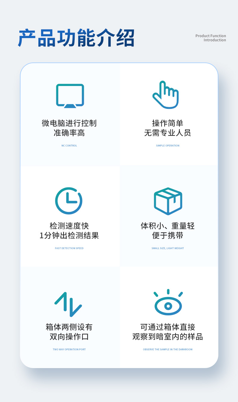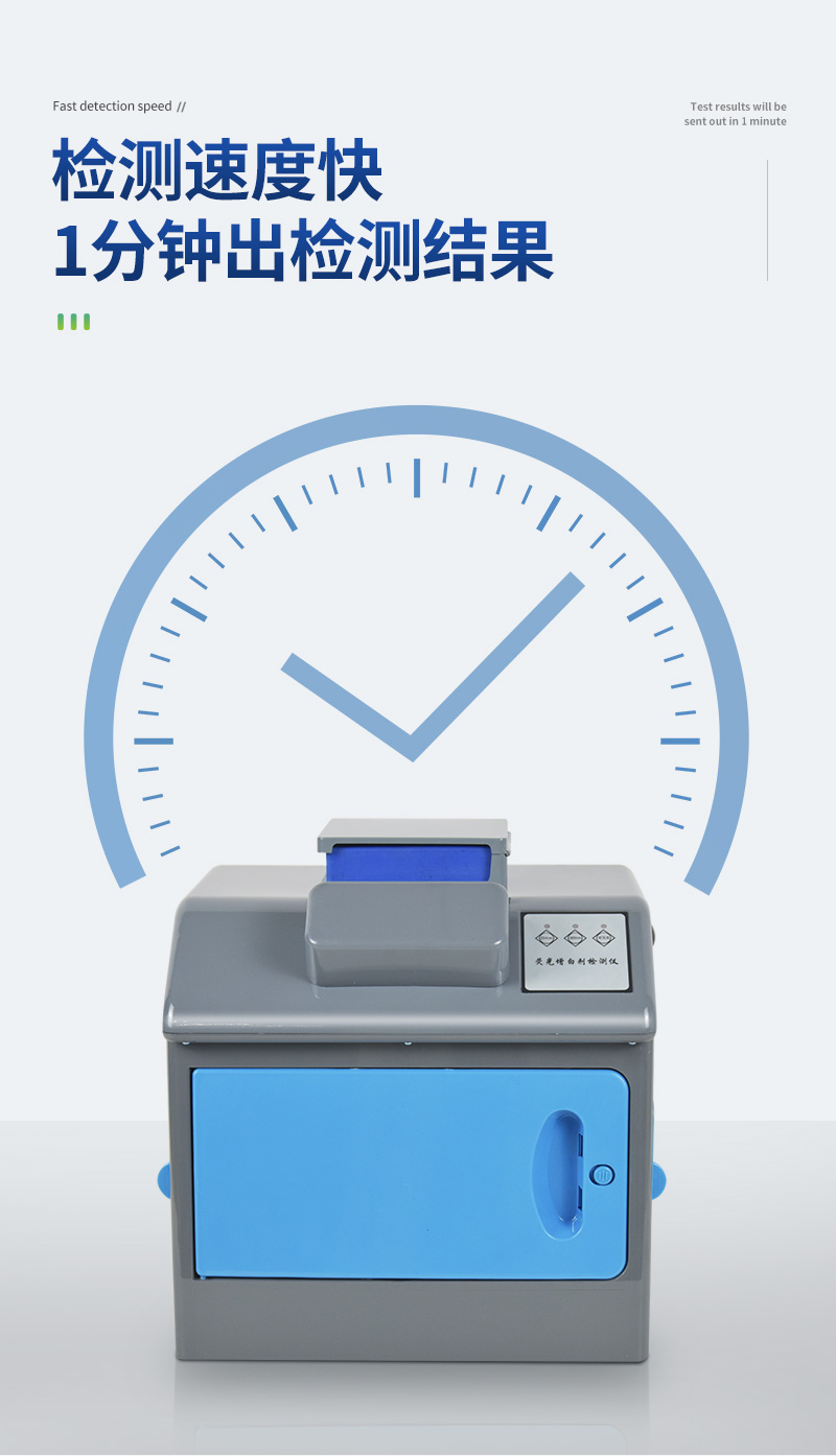 | ★1、采用微電腦進(jìn)行控制,準(zhǔn)確率高 | ★2、操作簡(jiǎn)單,無(wú)需專業(yè)人員 | ★3、檢測(cè)速度快,1分鐘出檢測(cè)結(jié)果 | ★4、體積小、重量輕、便于攜帶 |