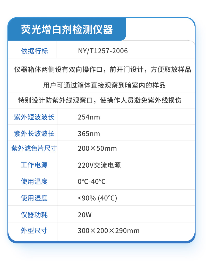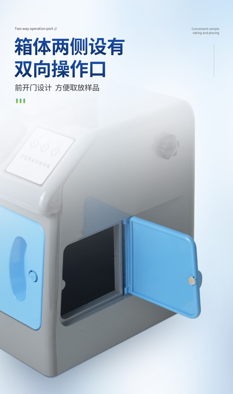 | ★依據(jù)行標(biāo):NY/T1257-2006 | ★儀器箱體兩側(cè)設(shè)有雙向操作口,前開(kāi)門設(shè)計(jì),方便取放樣品。 | ★用戶可通過(guò)箱體直接觀察到暗室內(nèi)的樣品。 | ★特別設(shè)計(jì)防紫外線觀察口,使操作人員避免紫外線損傷。 | ★紫外短波波長(zhǎng):254nm | ★紫外長(zhǎng)波波長(zhǎng):365nm | ★可見(jiàn)光源 | ★紫外濾色片尺寸:200×50mm | ★工作電源: 220V交流電源 | ★使用溫度: 0℃-40℃ | ★使用濕度:<90% (40℃) | ★儀器功耗: 20W | ★外型尺寸:300×200×290mm |