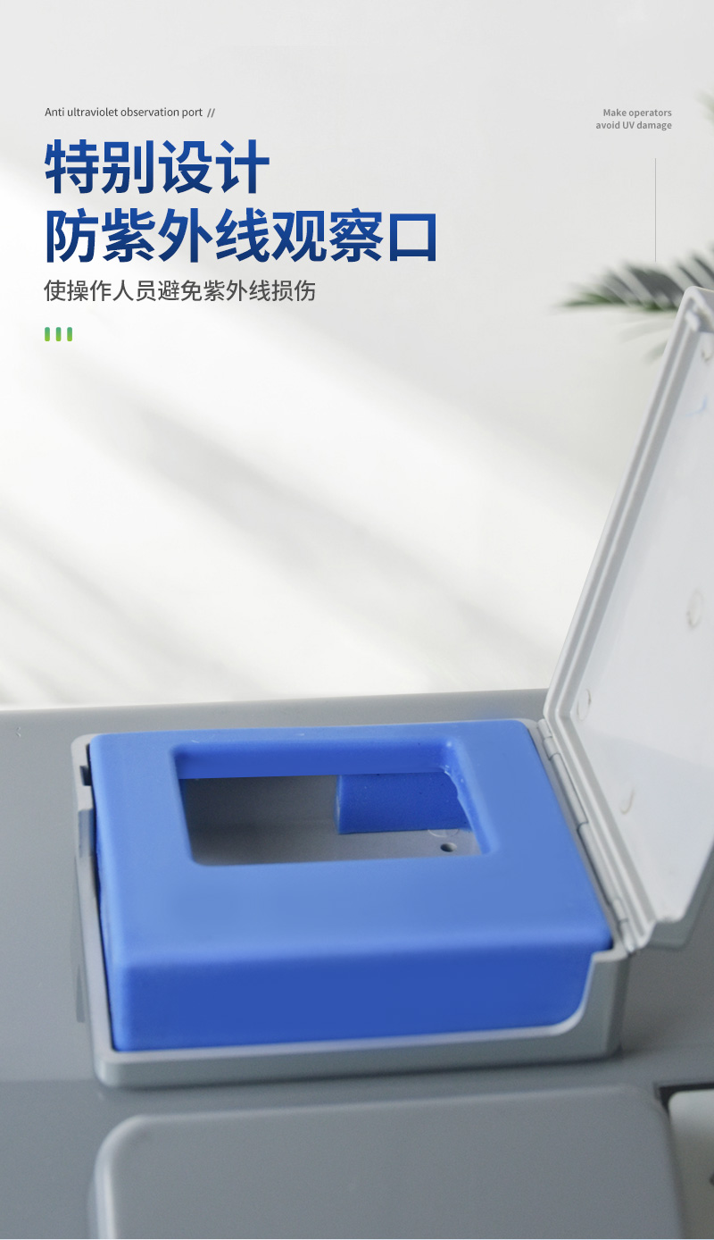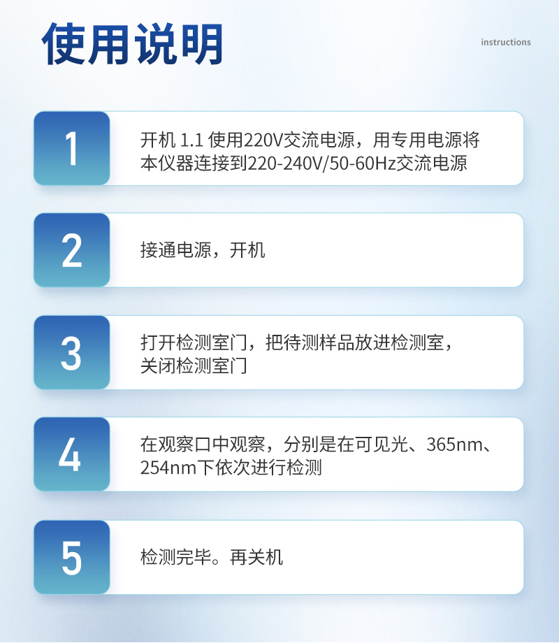| 1、開(kāi)機(jī) 1.1 使用220V交流電源,用專用電源將本儀器連接到220-240V/50-60Hz交流電源。 | 2、操作程序 | 2.1 接通電源,開(kāi)機(jī) | 2.2 打開(kāi)檢測(cè)室門,把待測(cè)樣品放進(jìn)檢測(cè)室,關(guān)閉檢測(cè)室門 | 2.3 在觀察口中觀察,分別是在可見(jiàn)光、365nm、254nm下依次進(jìn)行檢測(cè)。 | 2.4 檢測(cè)完畢。再關(guān)機(jī)。 |