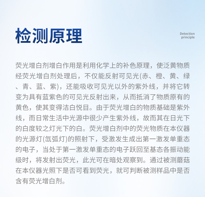 | 熒光增白劑是一種熒光染料,或稱為白色染料,也是一種復(fù)雜的有機(jī)化合物。它的特性是能激發(fā)入射光線產(chǎn)生熒光,使所染物質(zhì)獲得類似熒石的閃閃發(fā)光的效應(yīng),使肉眼看到的物質(zhì)很白,達(dá)到增白的效果;雖然目前沒(méi)有證明熒光劑吸收多少會(huì)對(duì)人體造成傷害,但是熒光增白劑已被列為潛在致癌因素之一,嚴(yán)禁在食品加工中使用;近年來(lái),部分經(jīng)銷商為了使一些價(jià)值較高的食用菌(如雙孢蘑菇、雞腿菇)增白、護(hù)色,延長(zhǎng)貨架期,在銷售前違法使用熒光增白劑或含有該成分的保鮮劑,造成浸染污染。此外,某些食用菌(如白靈菇),由于所用包裝紙是增白劑處理過(guò)的,造成沾染污染。 | 該熒光增白劑檢測(cè)儀:依據(jù)農(nóng)業(yè)部行業(yè)標(biāo)準(zhǔn):NY/T1257-2006《食用菌中熒光物質(zhì)的快速檢測(cè)》進(jìn)行研發(fā),可廣泛應(yīng)用于食用菌或含有熒光增白劑成分作為保鮮劑的農(nóng)產(chǎn)品質(zhì)量安全的快速檢測(cè);適用于農(nóng)產(chǎn)品檢測(cè)單位、工商部門檢測(cè)取證,同時(shí)也適用于農(nóng)產(chǎn)品貿(mào)易市場(chǎng)、超市、大中學(xué)校、賓館酒家、以及經(jīng)銷商自檢。 |