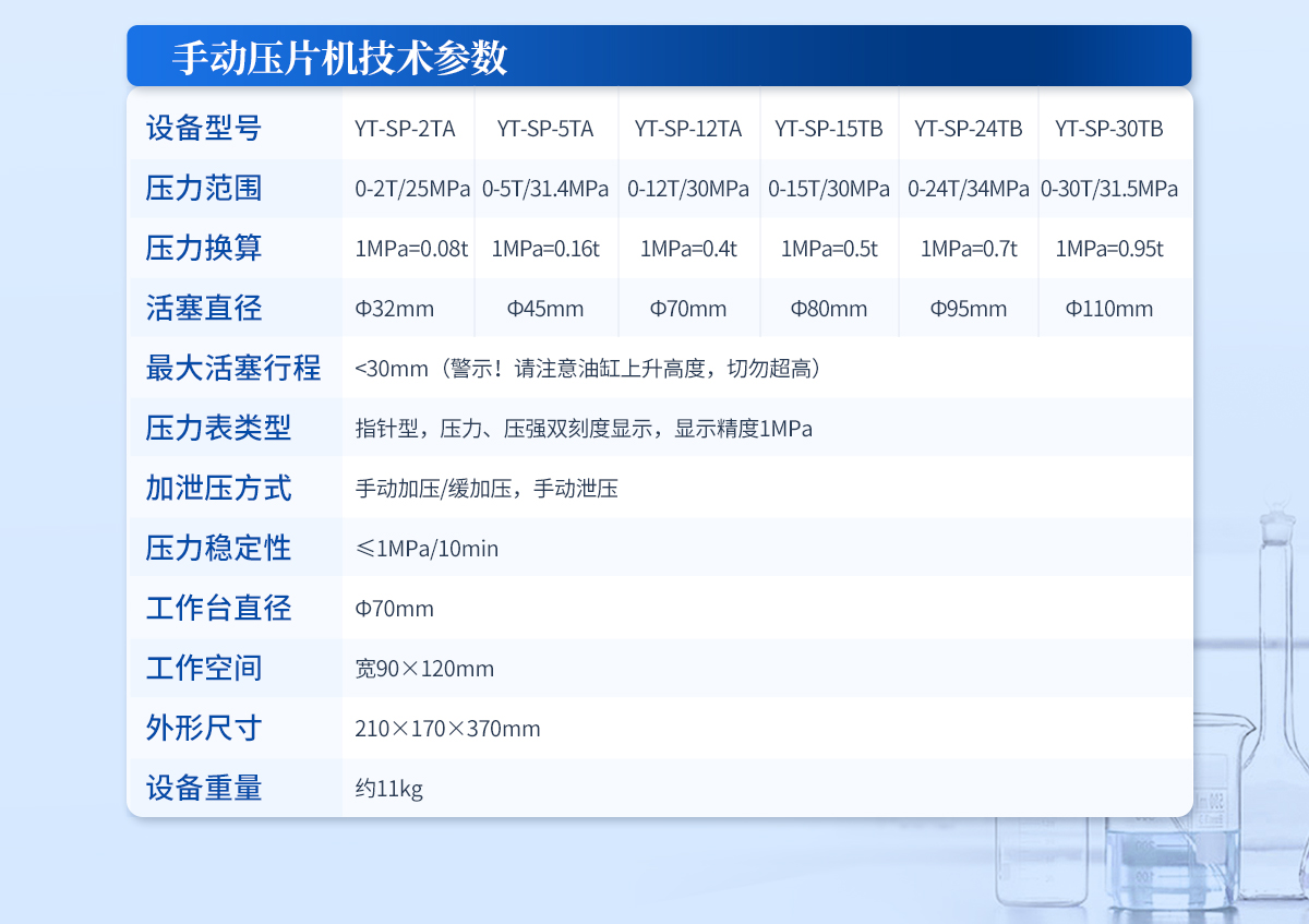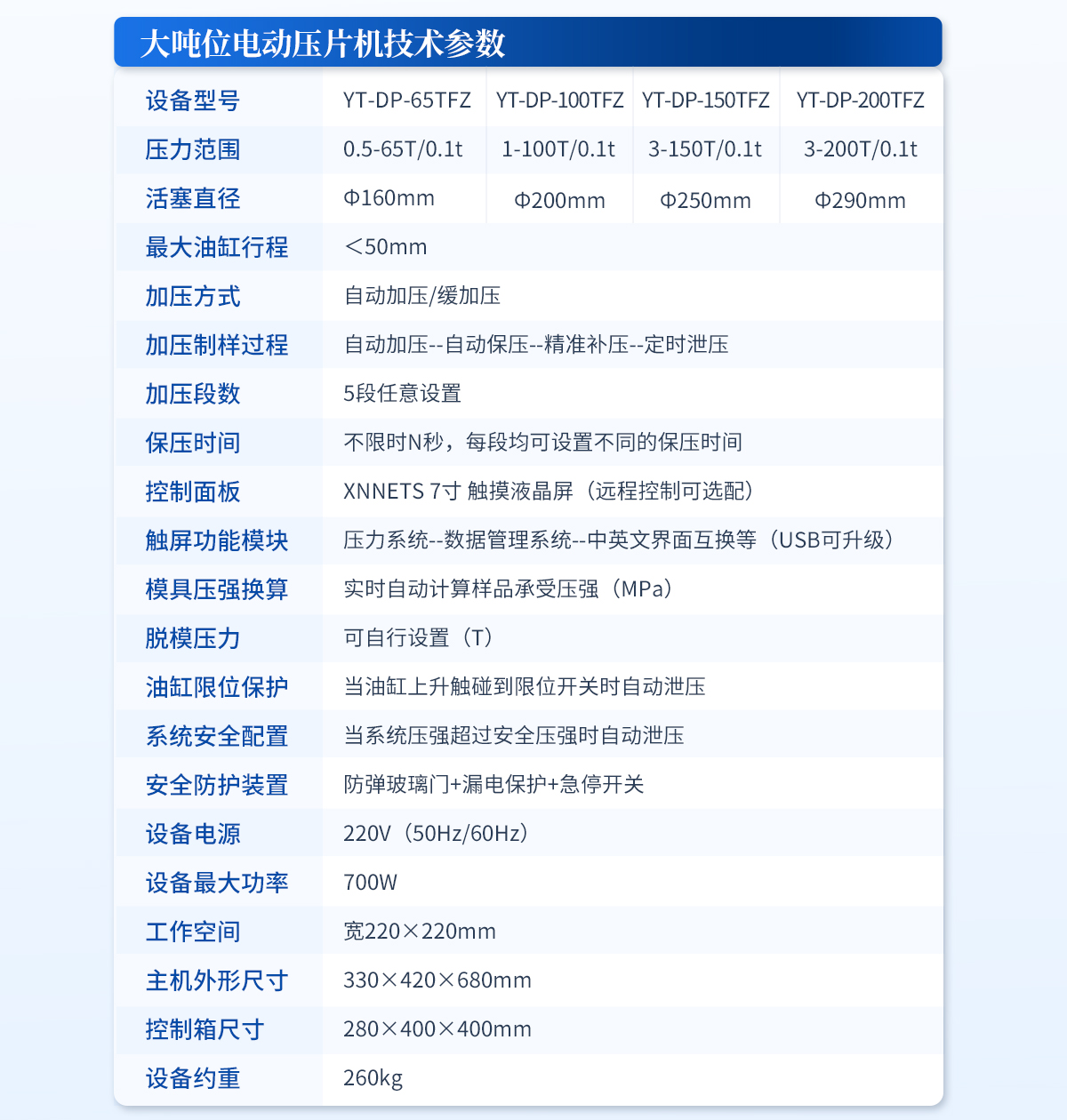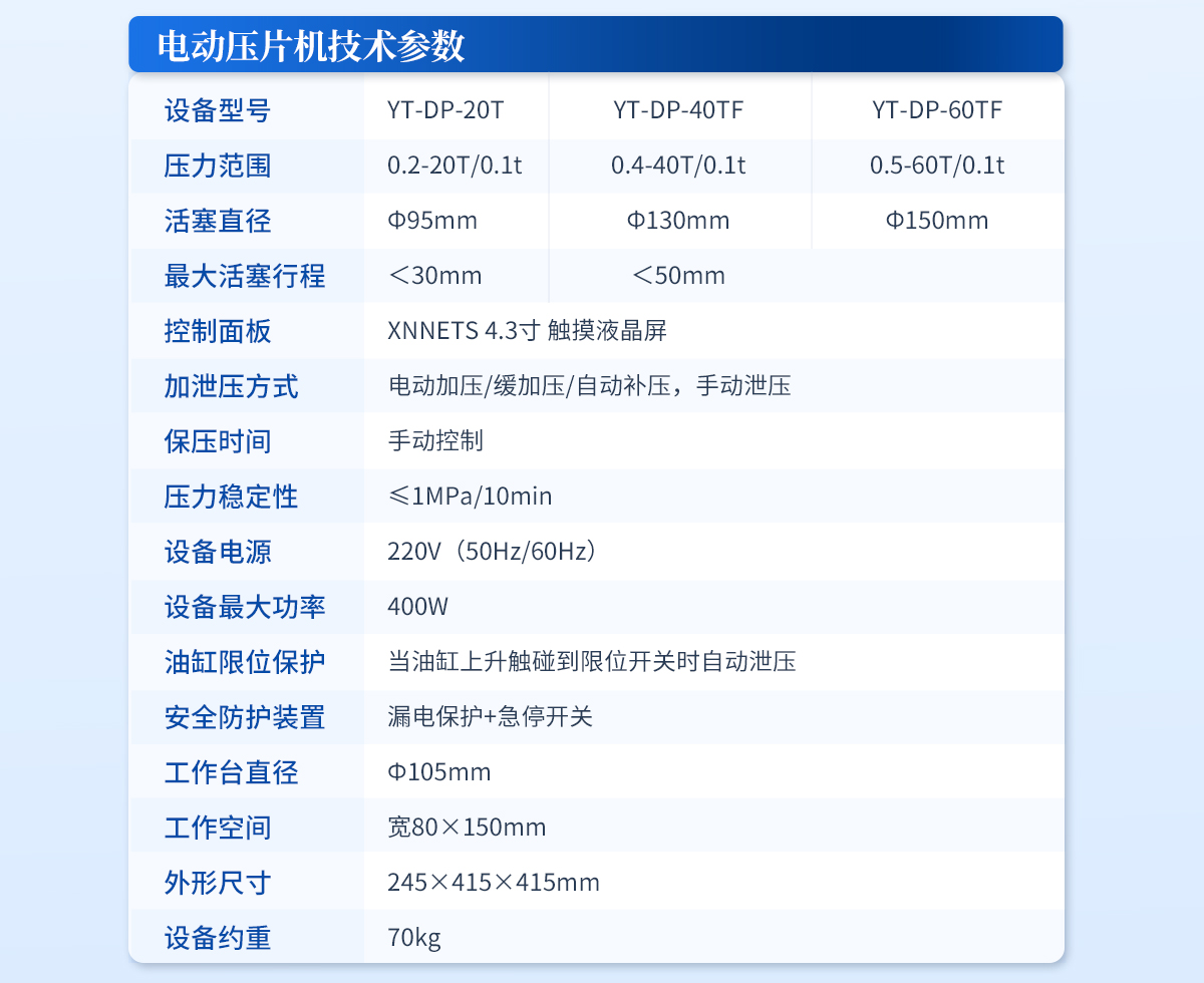 | 設備型號:YT-ZP-40T | 壓力范圍:0.4-40T/0.1t | 油缸直徑:Ф130mm | 油缸行程 :<50mm | 加壓方式:自動加壓/緩加壓 | 加壓制樣過程:自動加壓--自動保壓--精準補壓--定時泄壓 | 加壓段數:5段任意設置 | 保壓時間:不限時N秒,每段均可設置不同的保壓時間 | 控制面板:XNNETS 7寸 觸摸液晶屏(遠程控制可選配) | 觸屏功能模塊:壓力系統--數據管理系統--中英文界面互換等(USB可升級) | 模具壓強換算:實時自動計算樣品承受壓強(MPa) | 脫模壓力:可自行設置(T) | 油缸限位保護:當油缸上升觸碰到限位開關時自動泄壓 | 系統安全配置:當系統壓強超過安全值時自動泄壓 | 安全防護裝置:防彈玻璃門+漏電保護+急停開關 | 設備電源:220V(50Hz/60Hz) | 設備**功率:400W | 工作空間:寬160×180mm | 外形尺寸 :280×460×550mm | 設備估重 :110kg | 配置說明:壓片機1臺,模具選配!可根據需求定制壓片機或模具 |